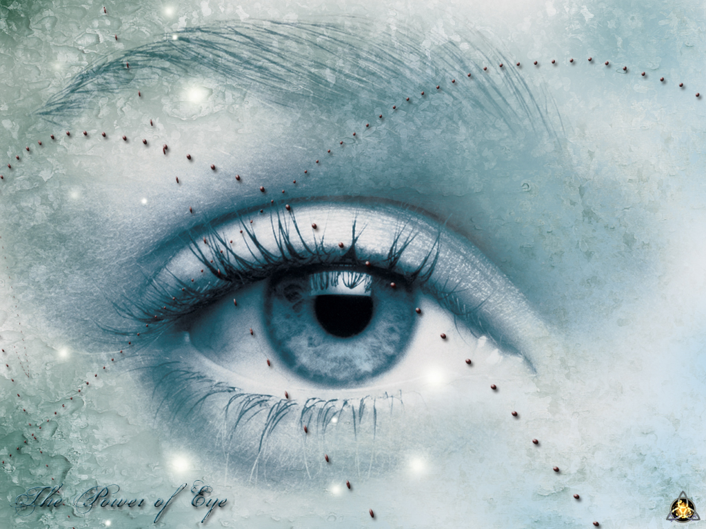 Description: A close up of a blue eye with a lot of tiny stars on it's iris and a white background.