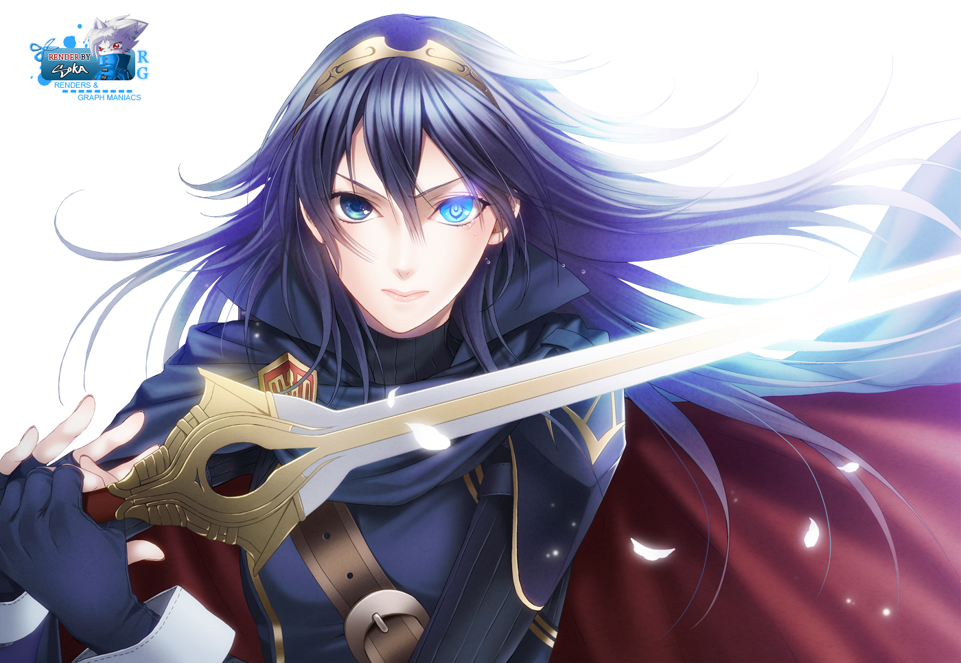 Description: A woman with blue eyes holding a sword and wearing a blue outfit with gold trims and a red cape.