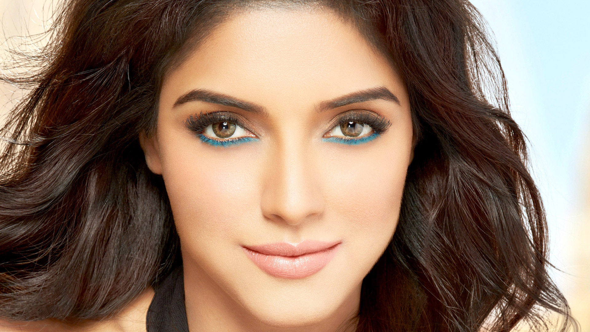 Description: A woman with blue eyes and a black shirt on her shoulders and a black tie on her neck and a blue eyeliner.