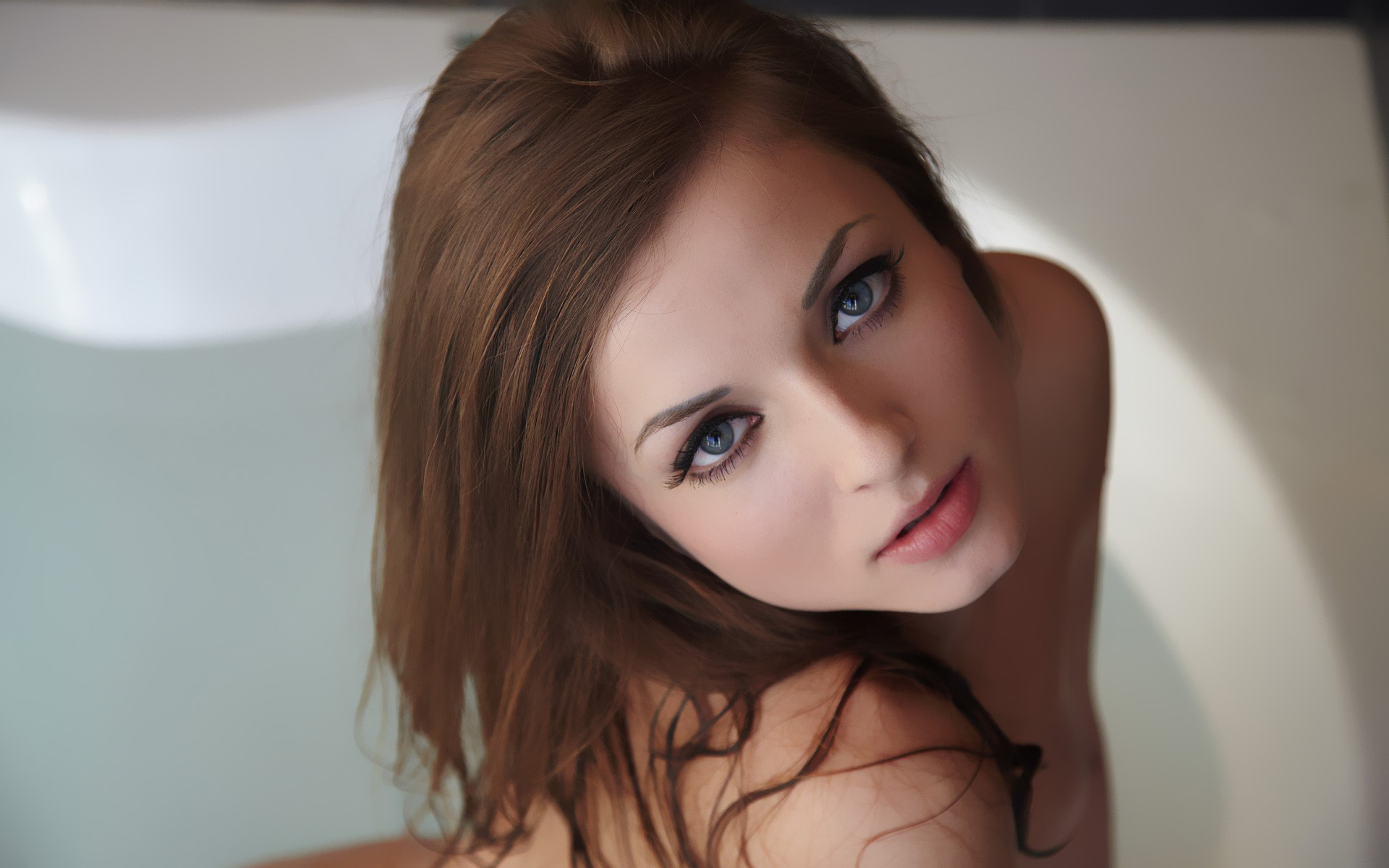 Description: A woman with blue eyes is posing for a picture in a bathtub with her hair blowing back and her eyes slightly closed.