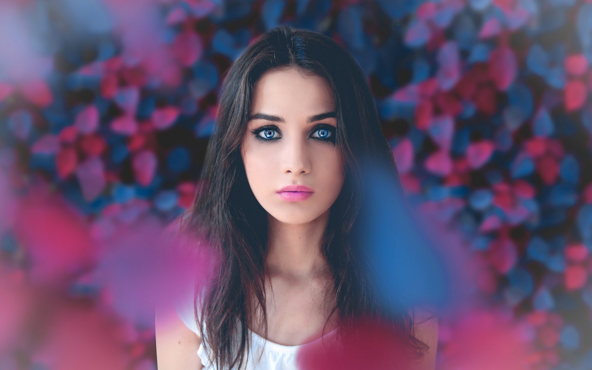 Description: A woman with blue eyes and long hair is looking at the camera with a blurry background of flowers.