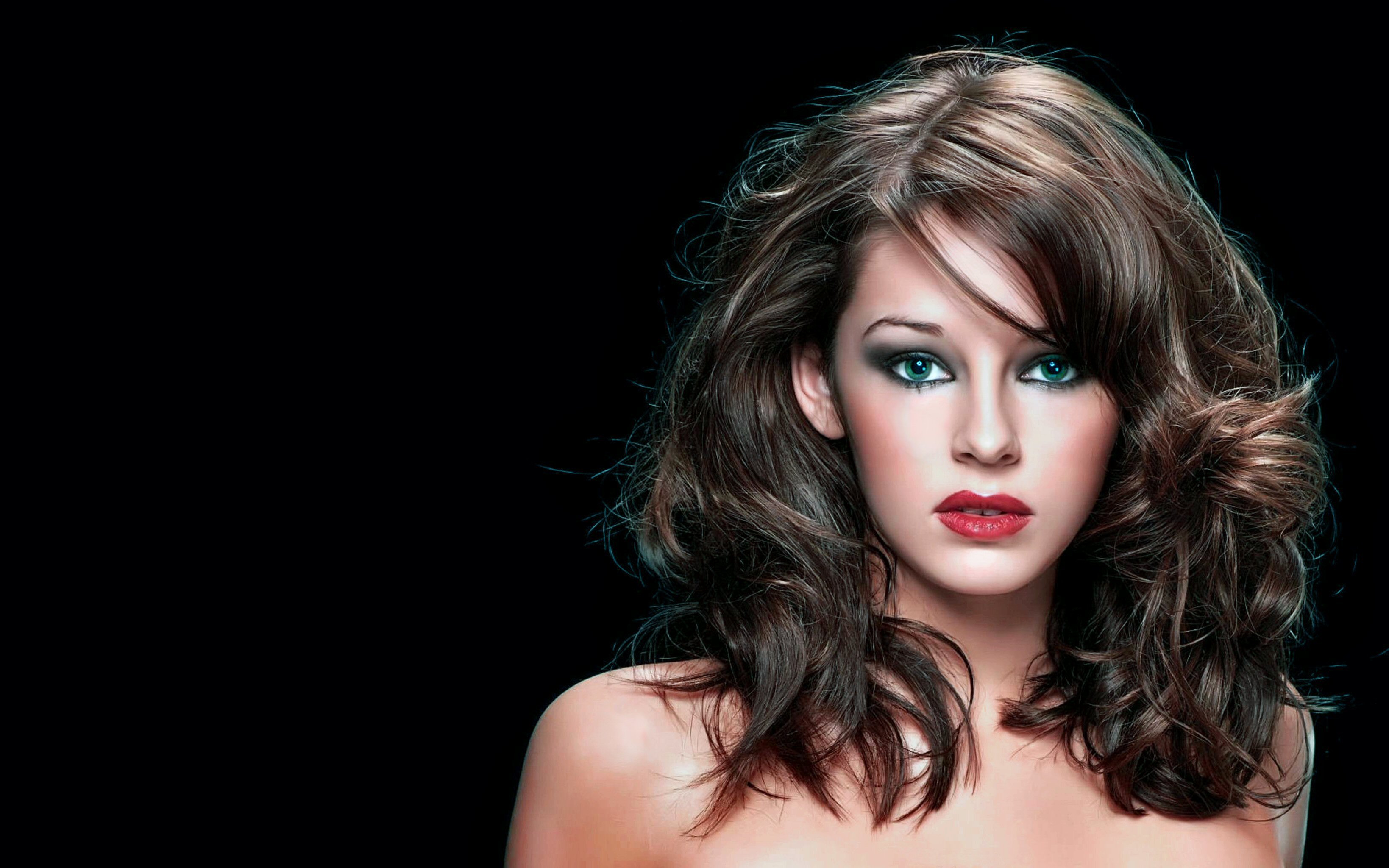 Description: A woman with blue eyes and a red lipstick on her face is posing for a picture with a black background.