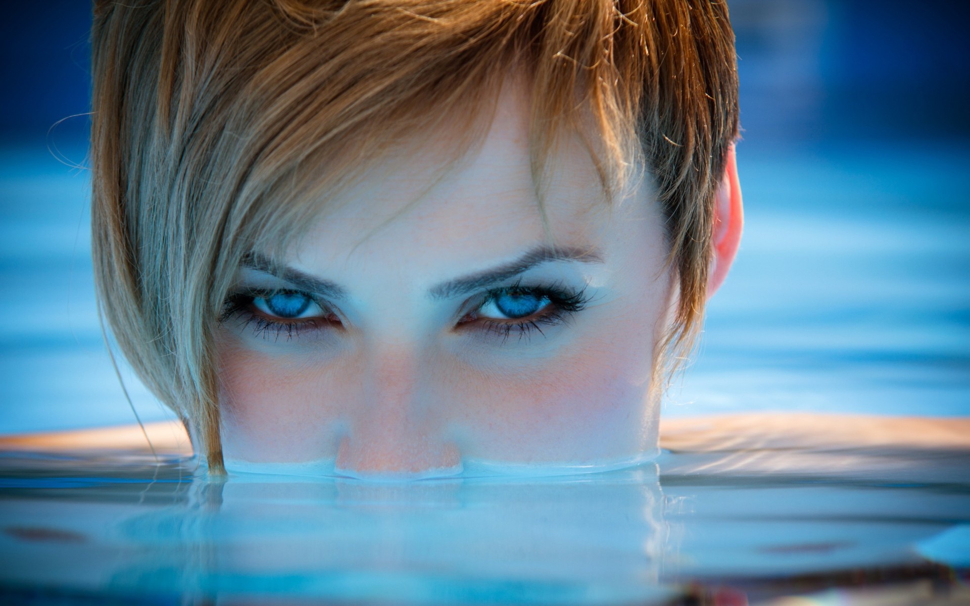 Description: A woman with blue eyes is submerged in water with a blue background and a blue background is reflected in the water.