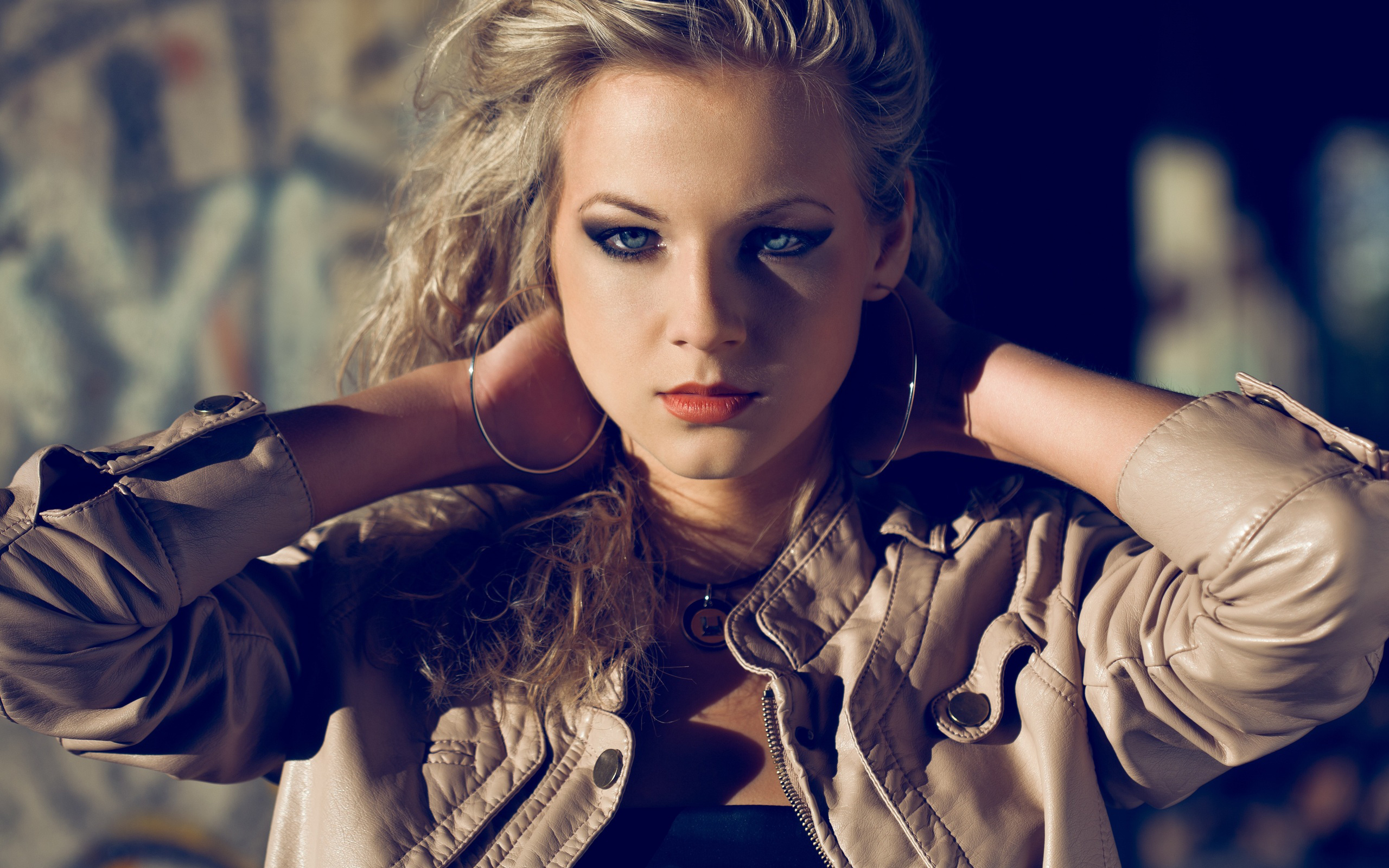 Description: A woman with blue eyes and a jacket on posing for a picture with her hands on her head and her hands on her ears.
