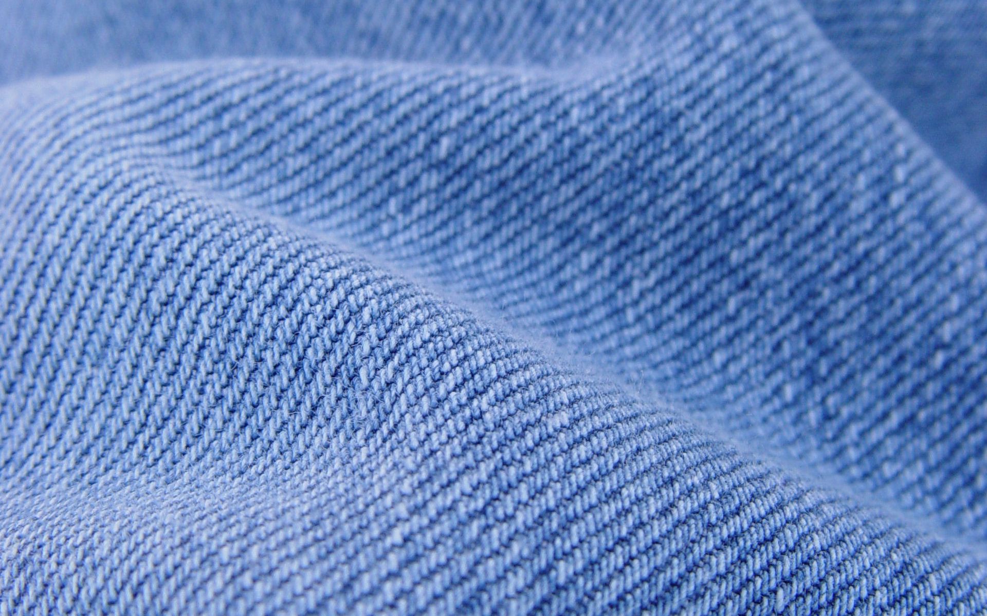 Description: A close up of a blue fabric textured with a thin line pattern on a plain background.