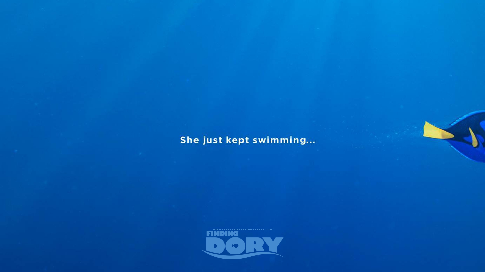 Description: A blue fish with a yellow fin swimming in the ocean with a quote above it that says she just kept swimming.