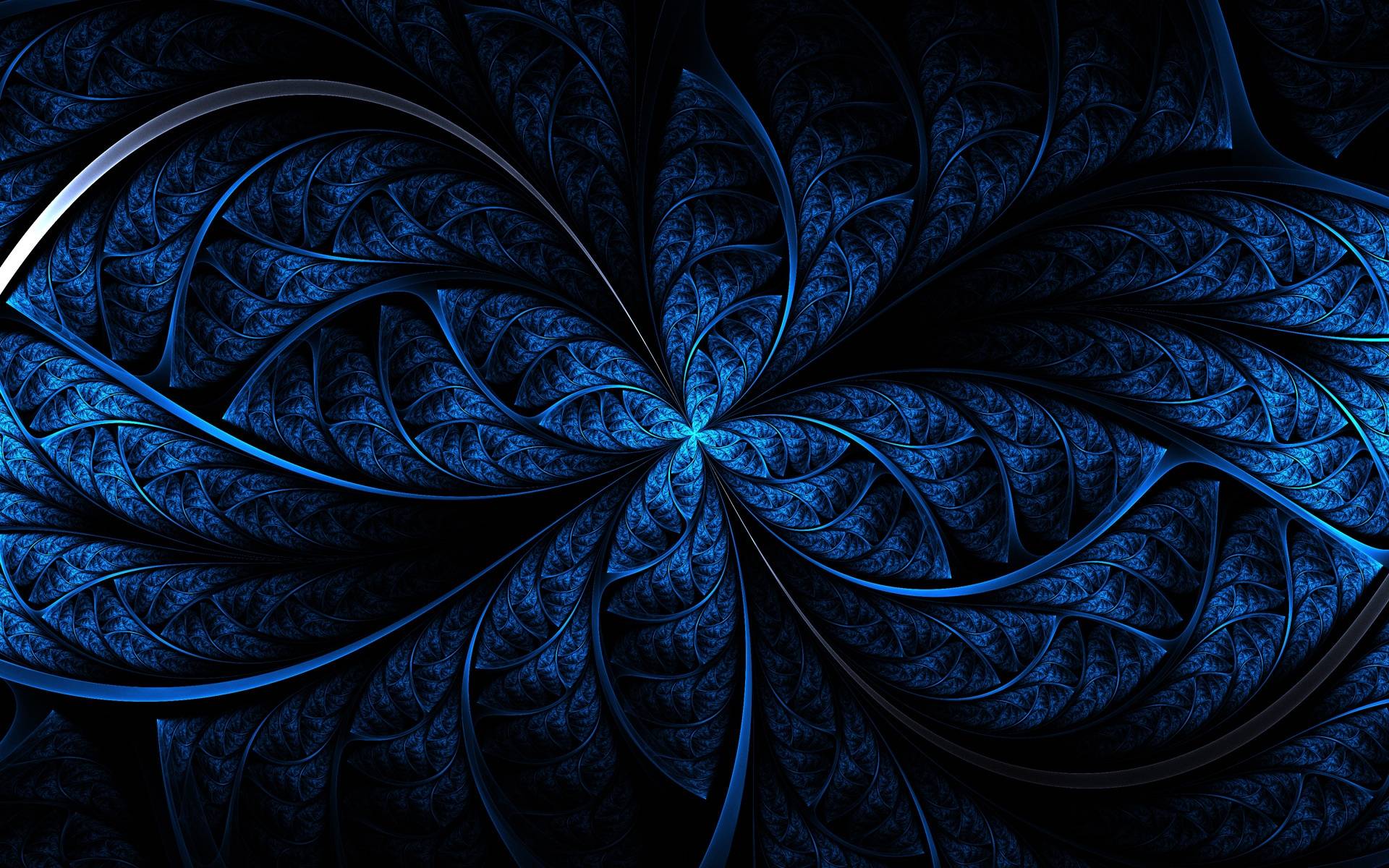 Description: A blue flower with a black background and a blue center in the middle of the flower is a spiral design.