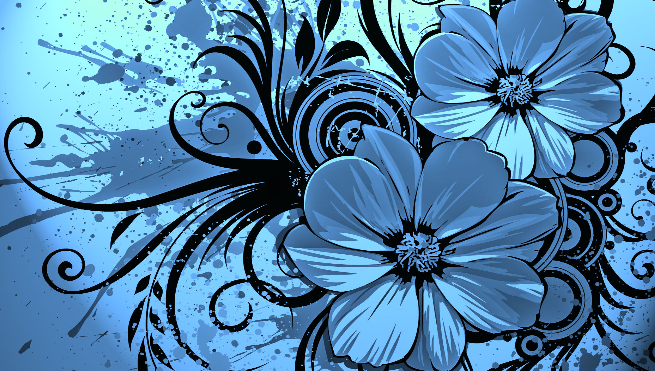 Description: A blue flower with black swirls and a blue background with a white flower on it's side.
