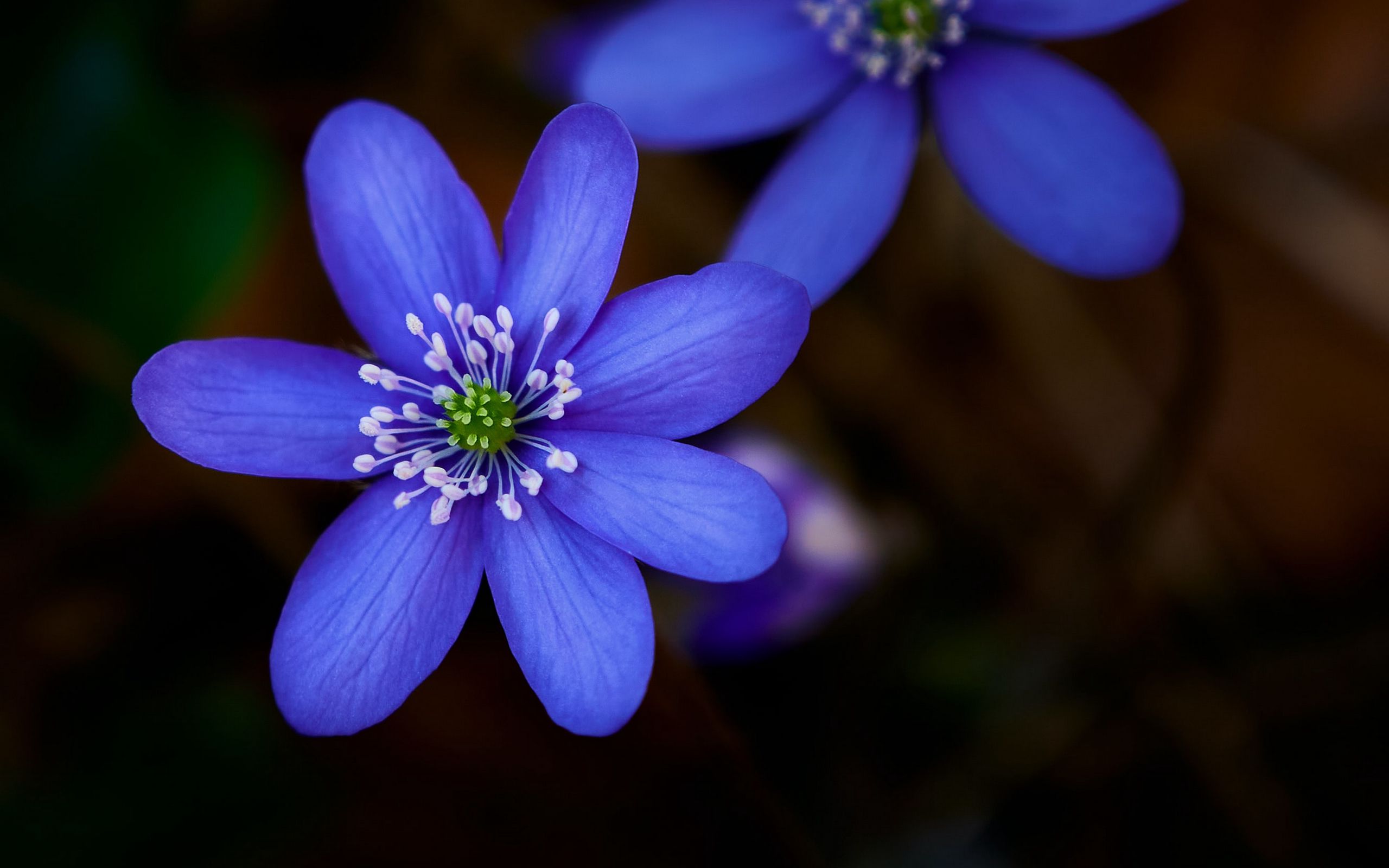 Description: Two blue flowers with white stamens on a dark background with green leaves and a blurry background.