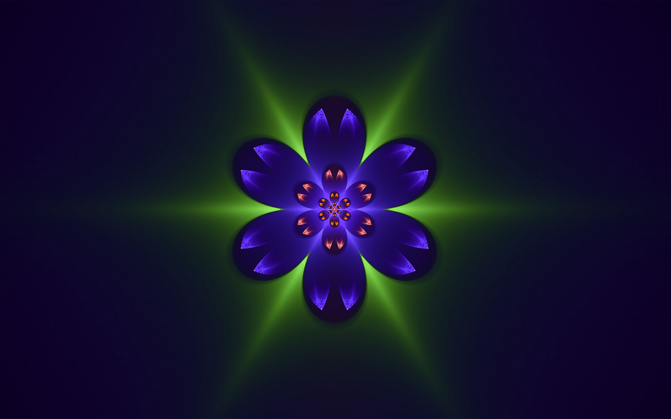 Description: A blue flower with a green center surrounded by green and red lights on a dark background with a green center.