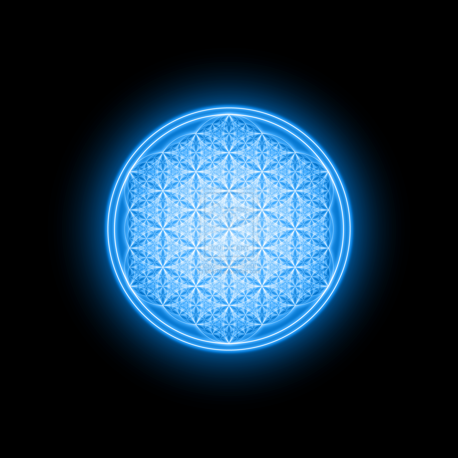 Description: A blue flower of life in the dark with a black background and a blue light in the center of the circle.