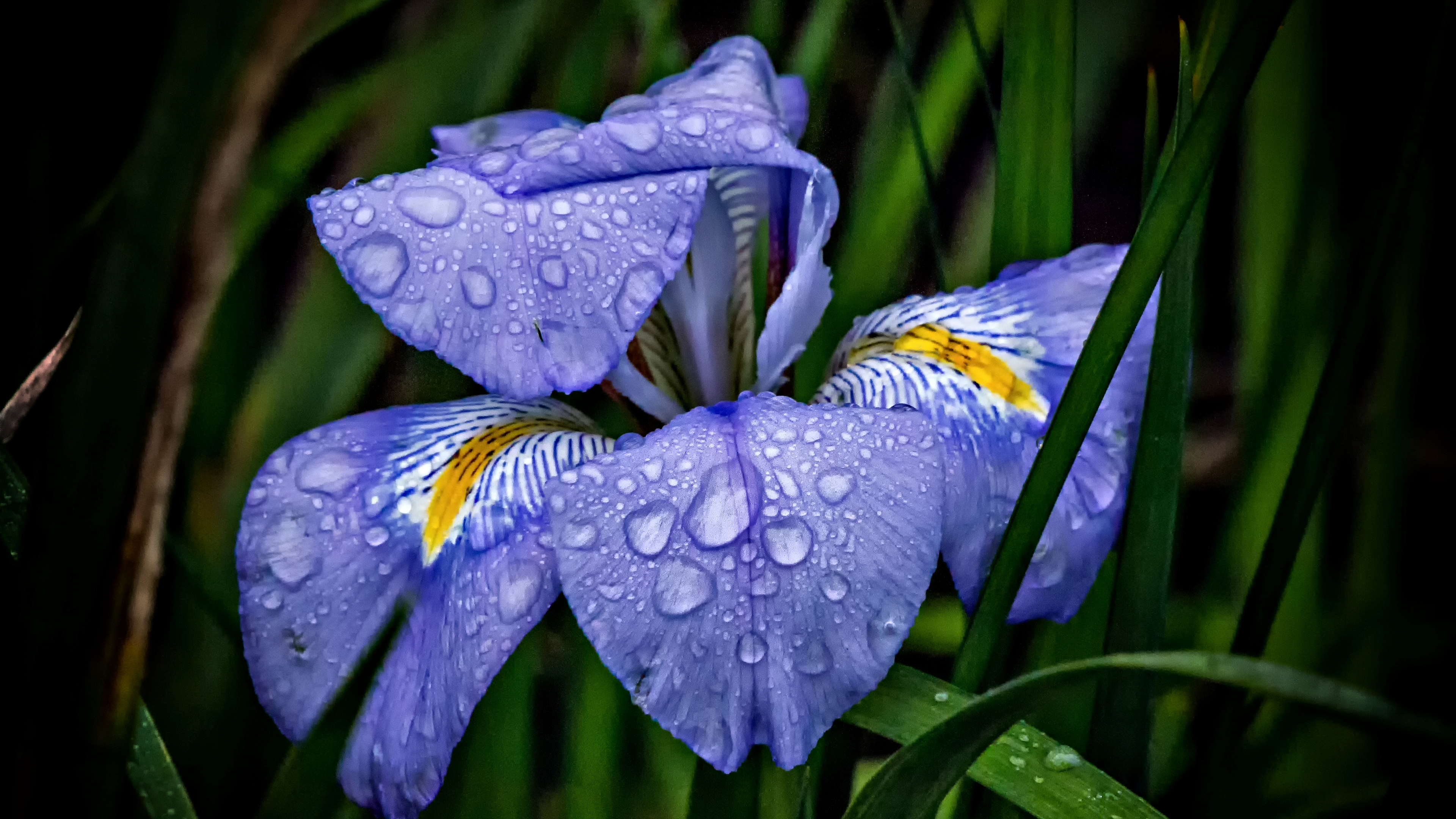 Description: A blue flower with water droplets on it's petals and green grass in the background.