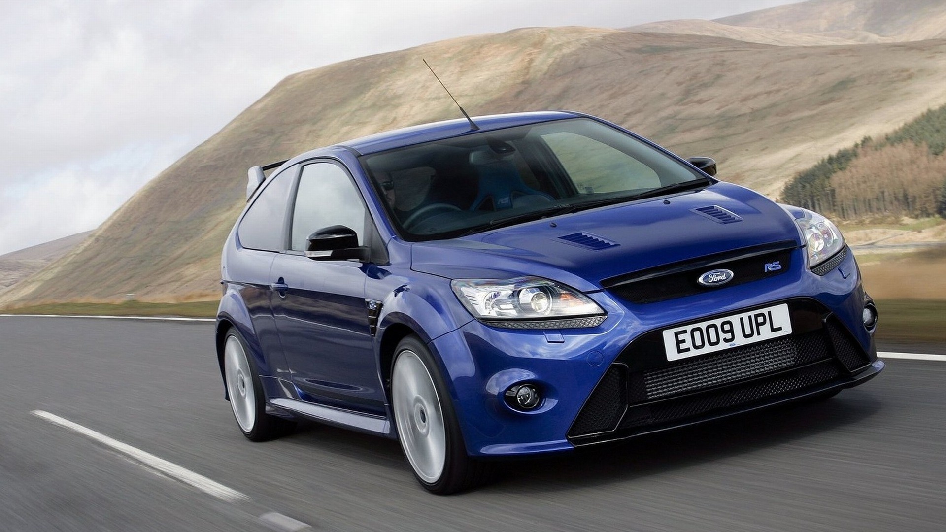 Description: A blue ford focus st driving down a road in the mountains with a mountain range in the background and a cloudy sky.