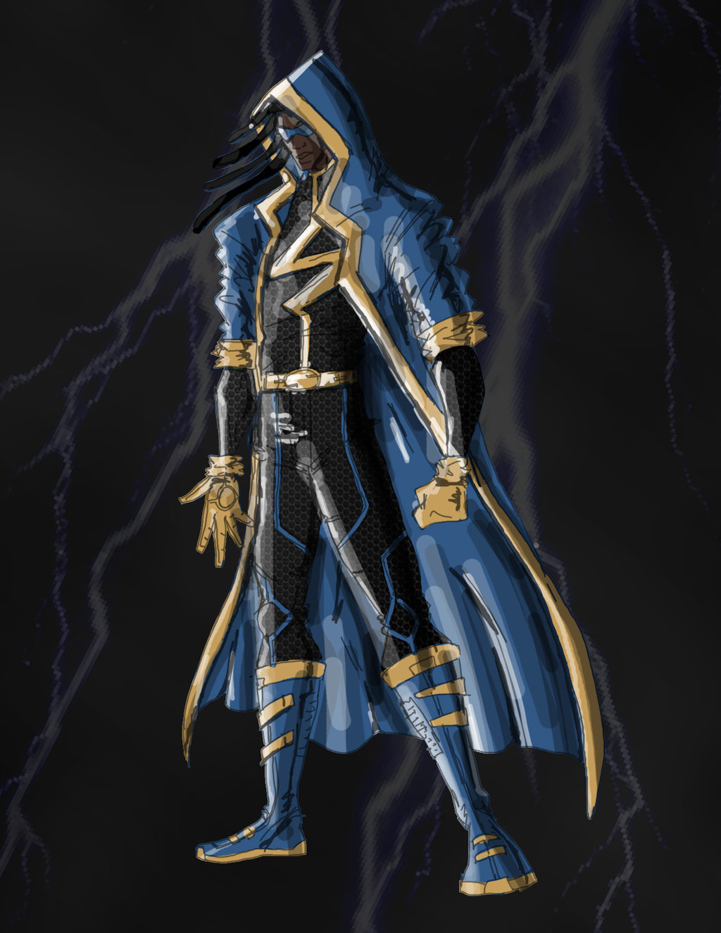 Description: A blue and gold colored character standing in front of a lightning background with lightning bolts behind him and a black background.
