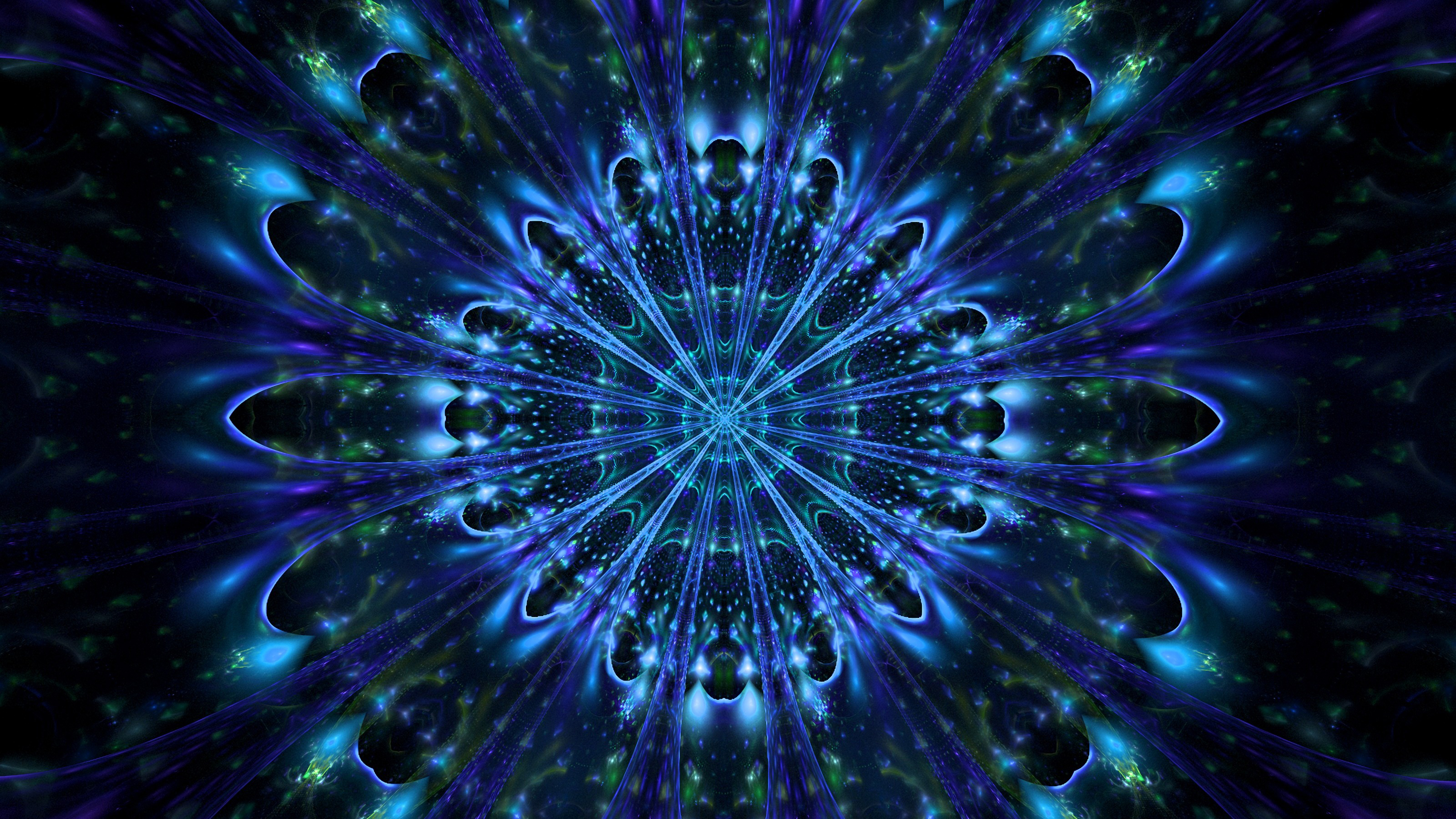 Description: A blue and green flower with a black background and a blue center with a black center and a blue center with a black center.