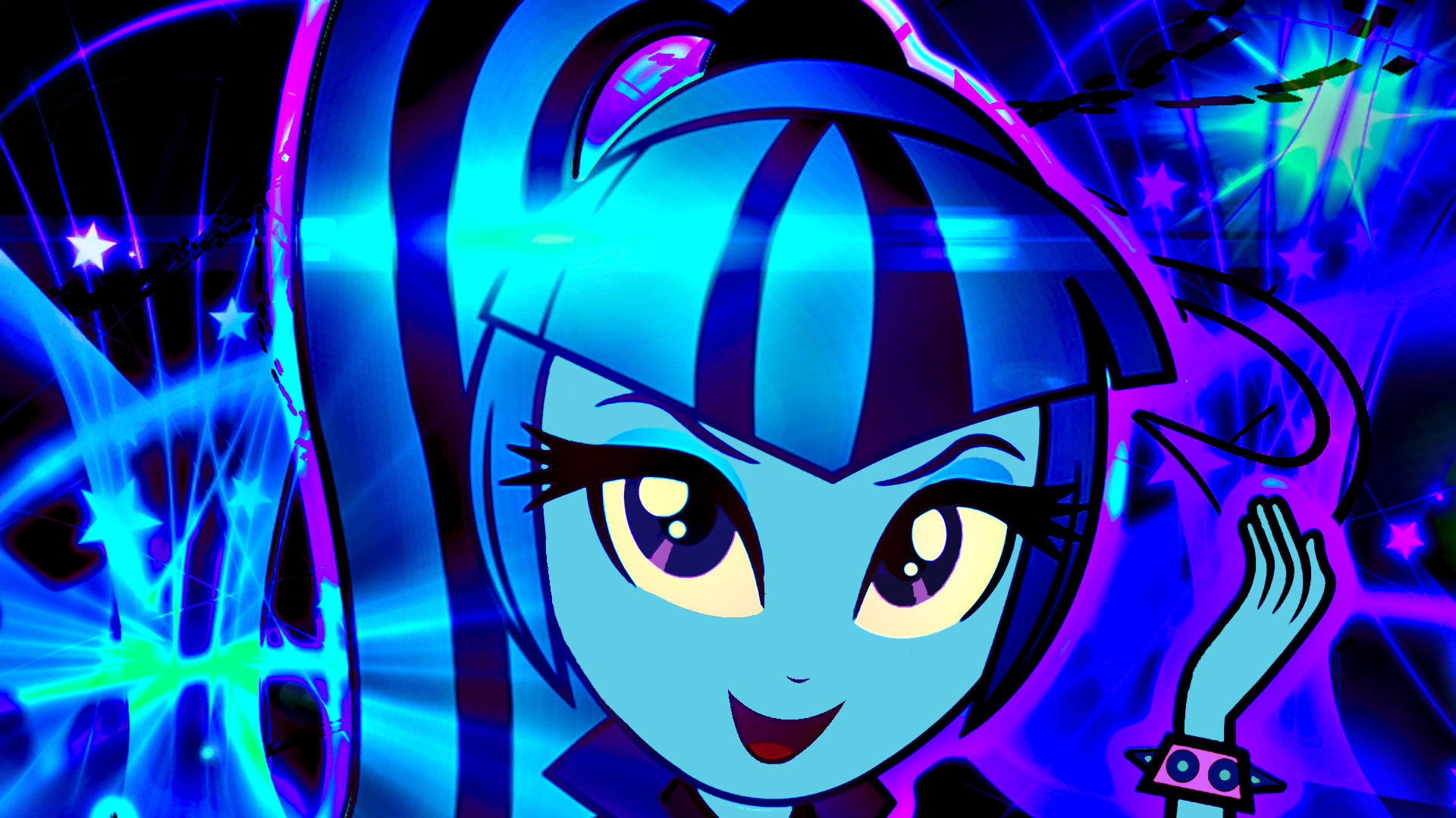 Description: A cartoon character with a blue hair and a black shirt and tie and a blue background with stars and a blue and purple light.