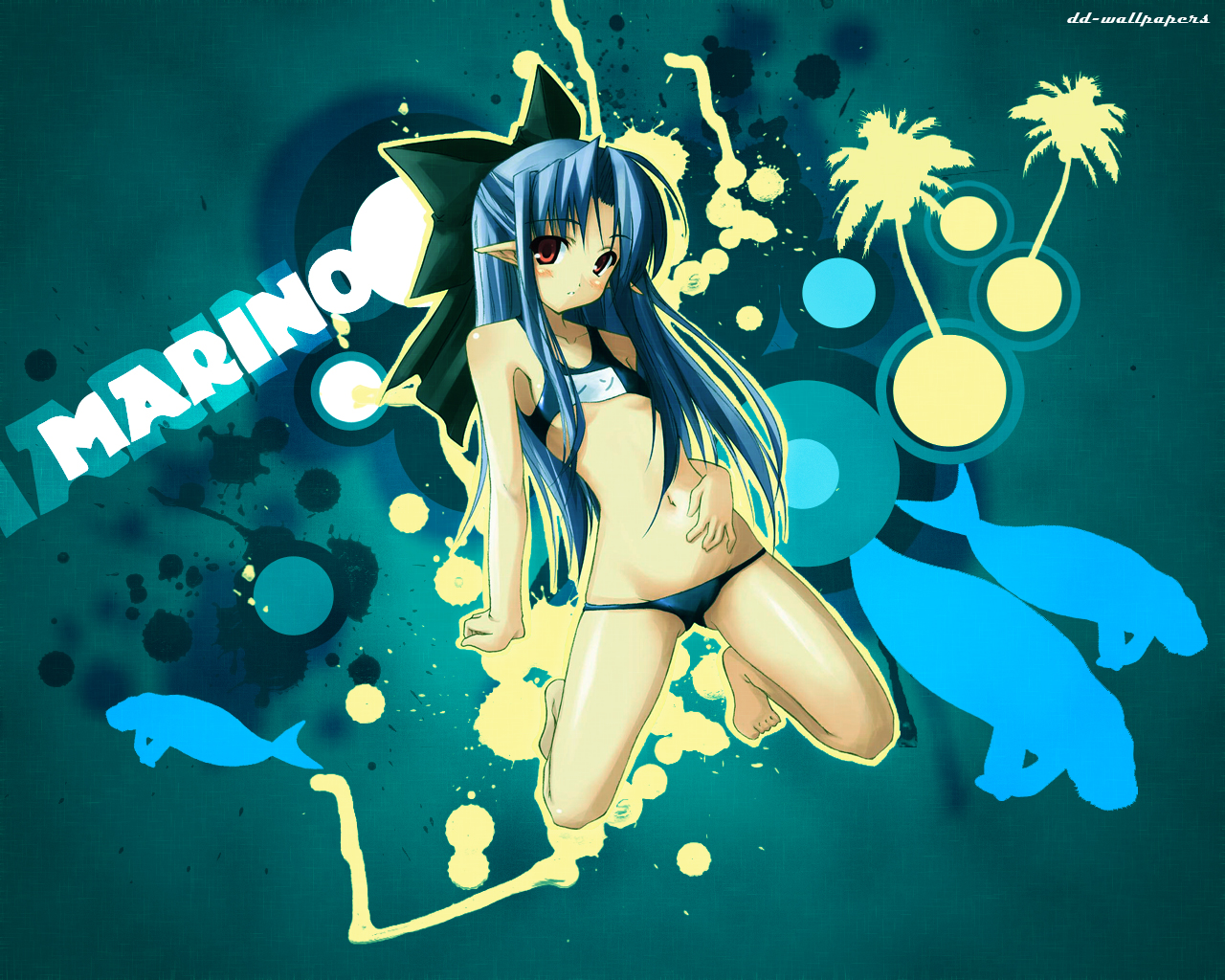 Description: A cartoon girl with blue hair and a bikini on a green background with blue and yellow shapes and fish.