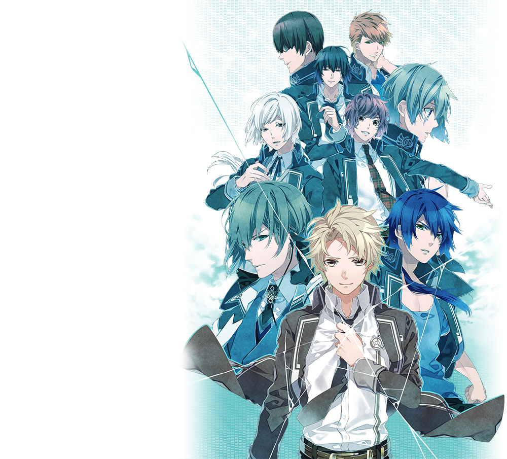 Description: A group of anime characters standing next to each other in front of a white background with blue hair and black hair.