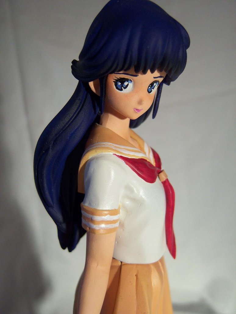 Description: A doll with a blue hair and a white shirt and a red tie on a white background with a white backdrop.