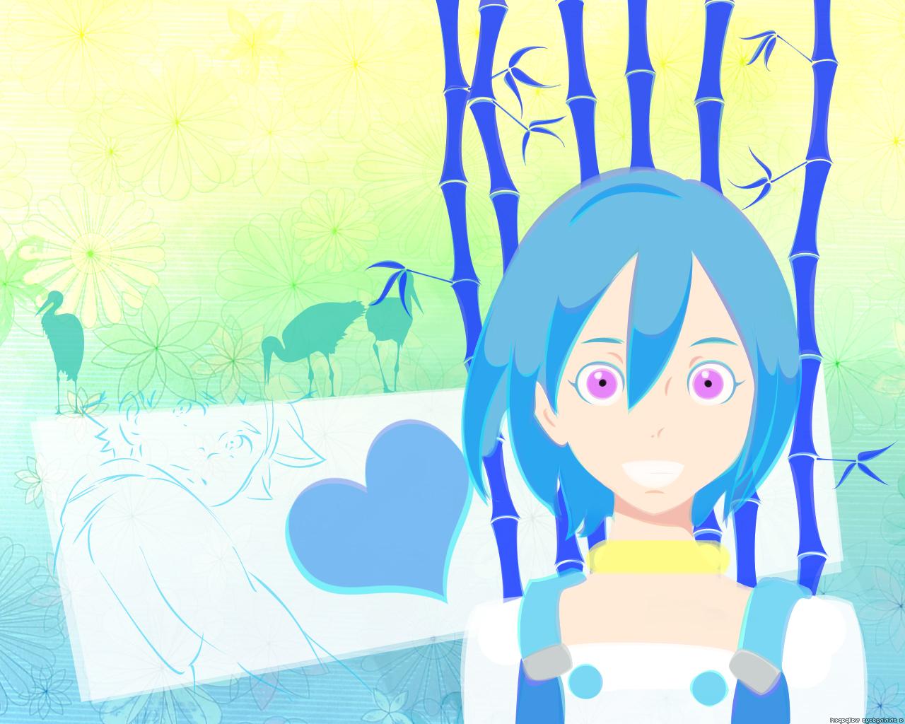 Description: A girl with blue hair and a blue heart in front of a bamboo tree with flowers and birds in the background.
