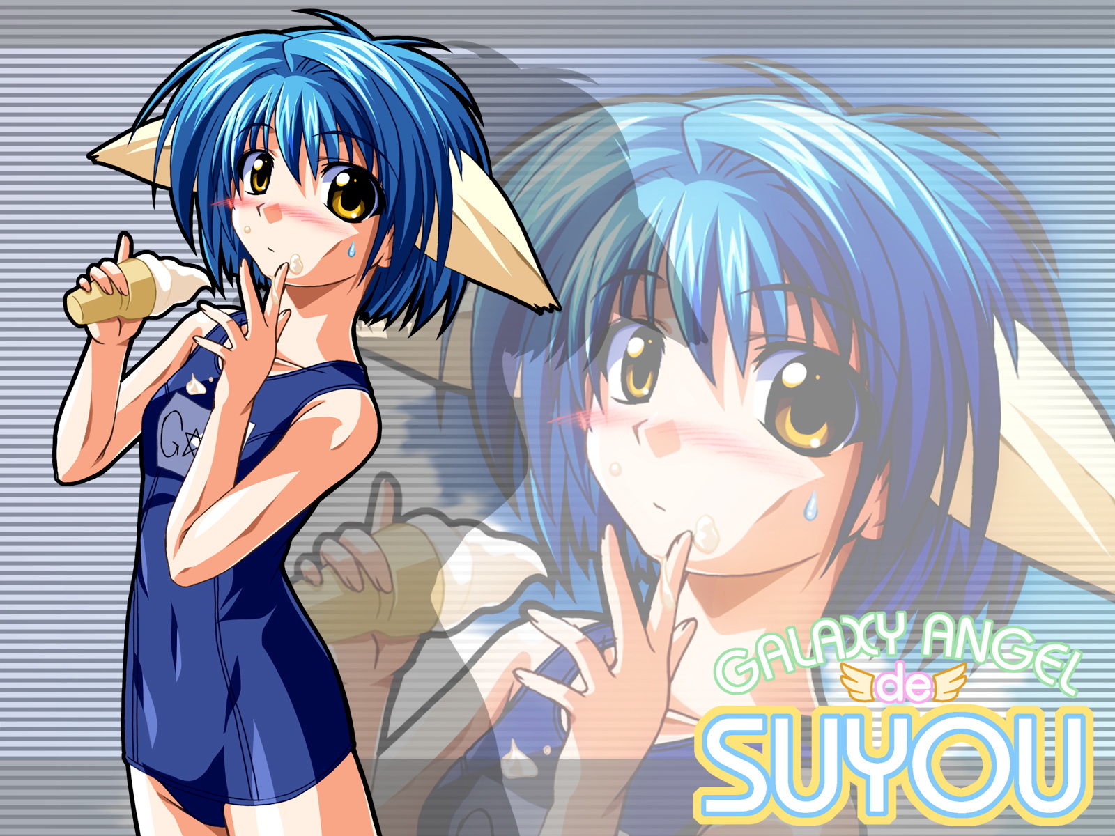 Description: A girl with blue hair and horns standing next to another girl with blue hair and horns on her head.