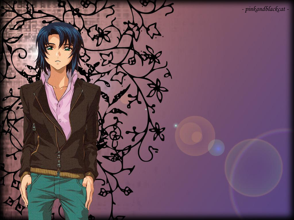 Description: A man with blue hair and a black jacket standing in front of a purple background with black leaves and branches.