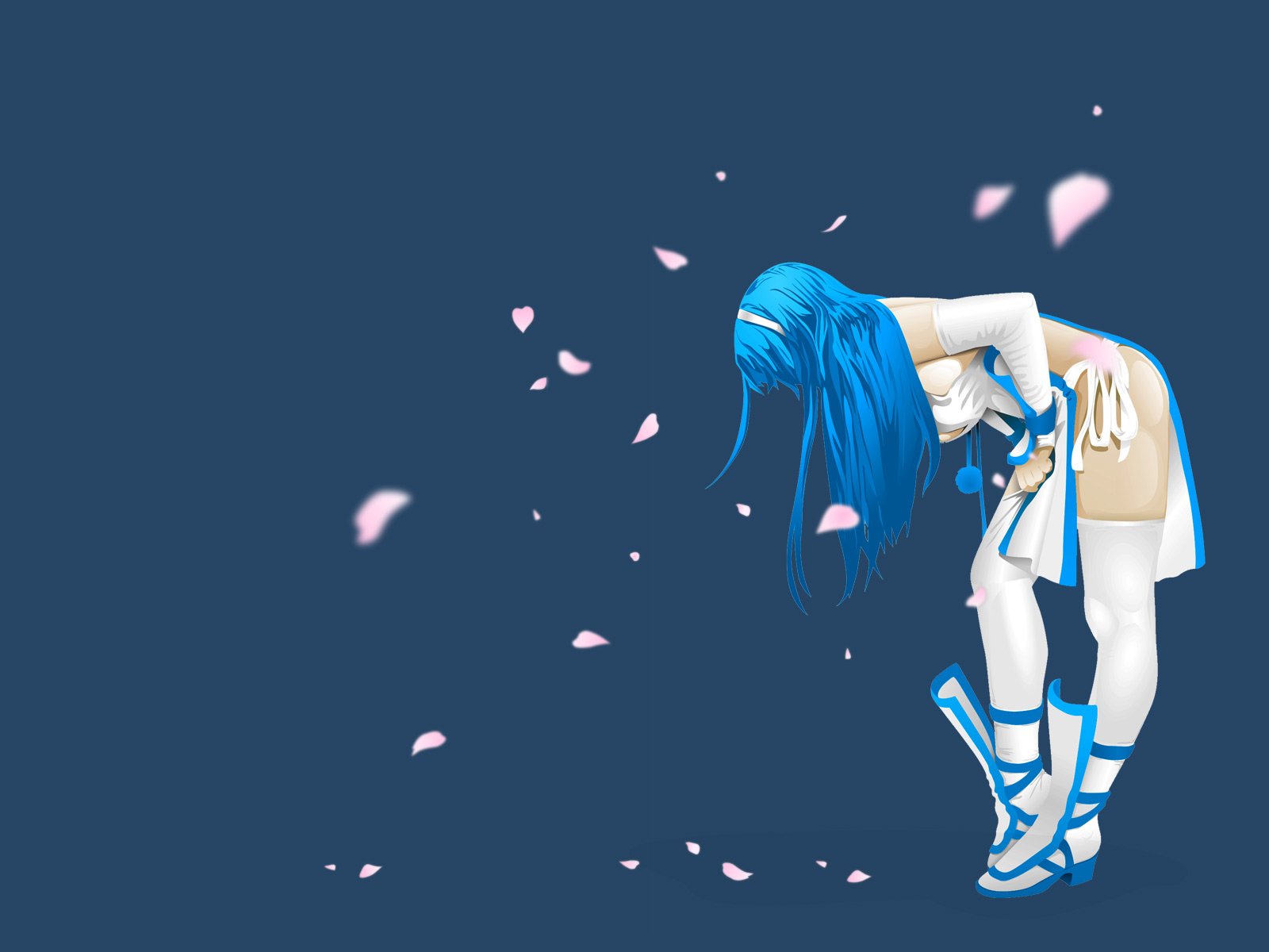 Description: A woman with blue hair and white clothes is bending over and looking down at her shoes and shoes on the ground.