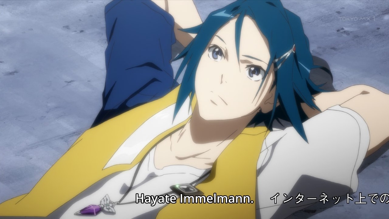 Description: A man with blue hair and a yellow vest is posing for a picture with his arms behind his head.