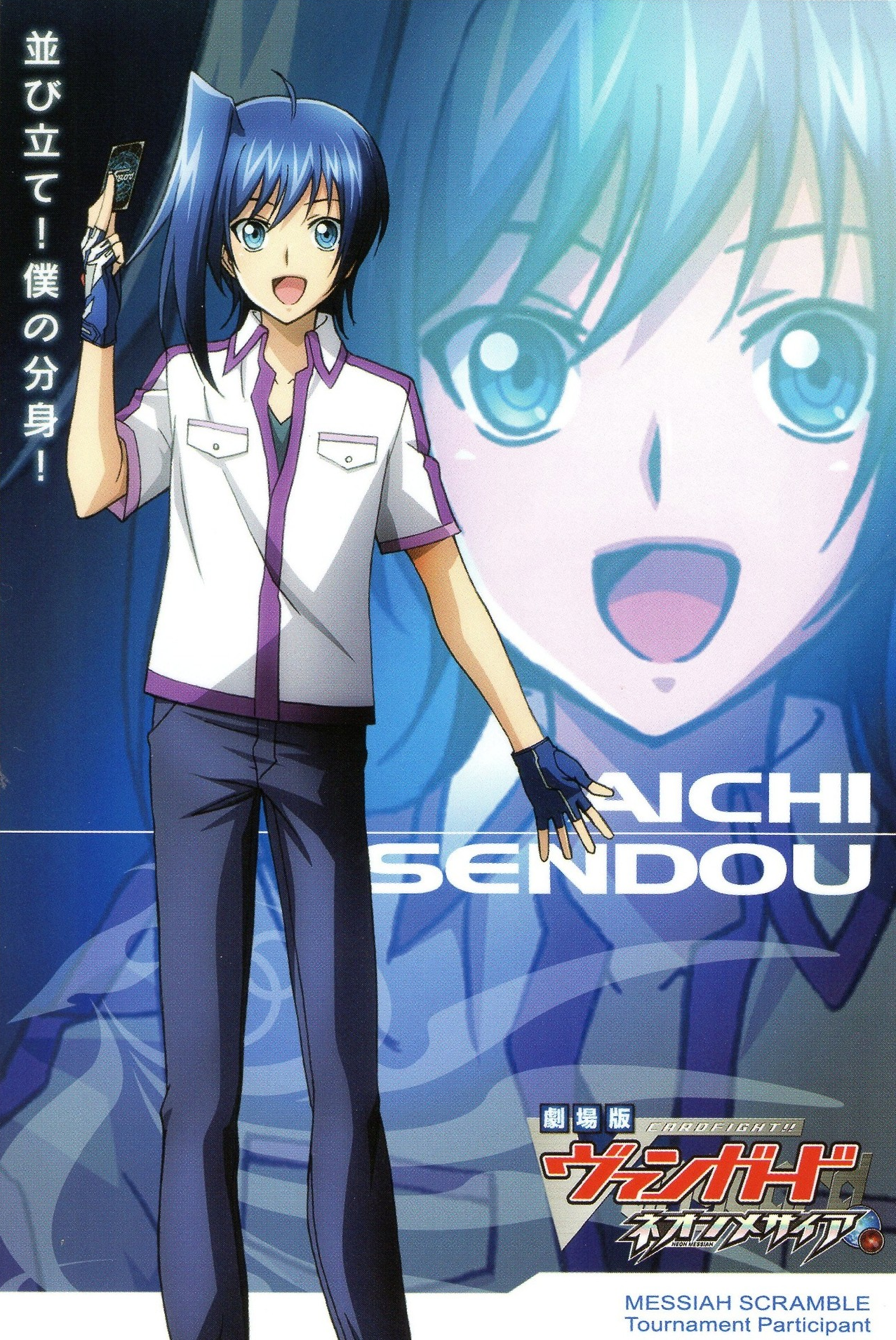 Description: A anime character with blue hair and a white shirt and tie holding a cell phone in her hand and a blue background.
