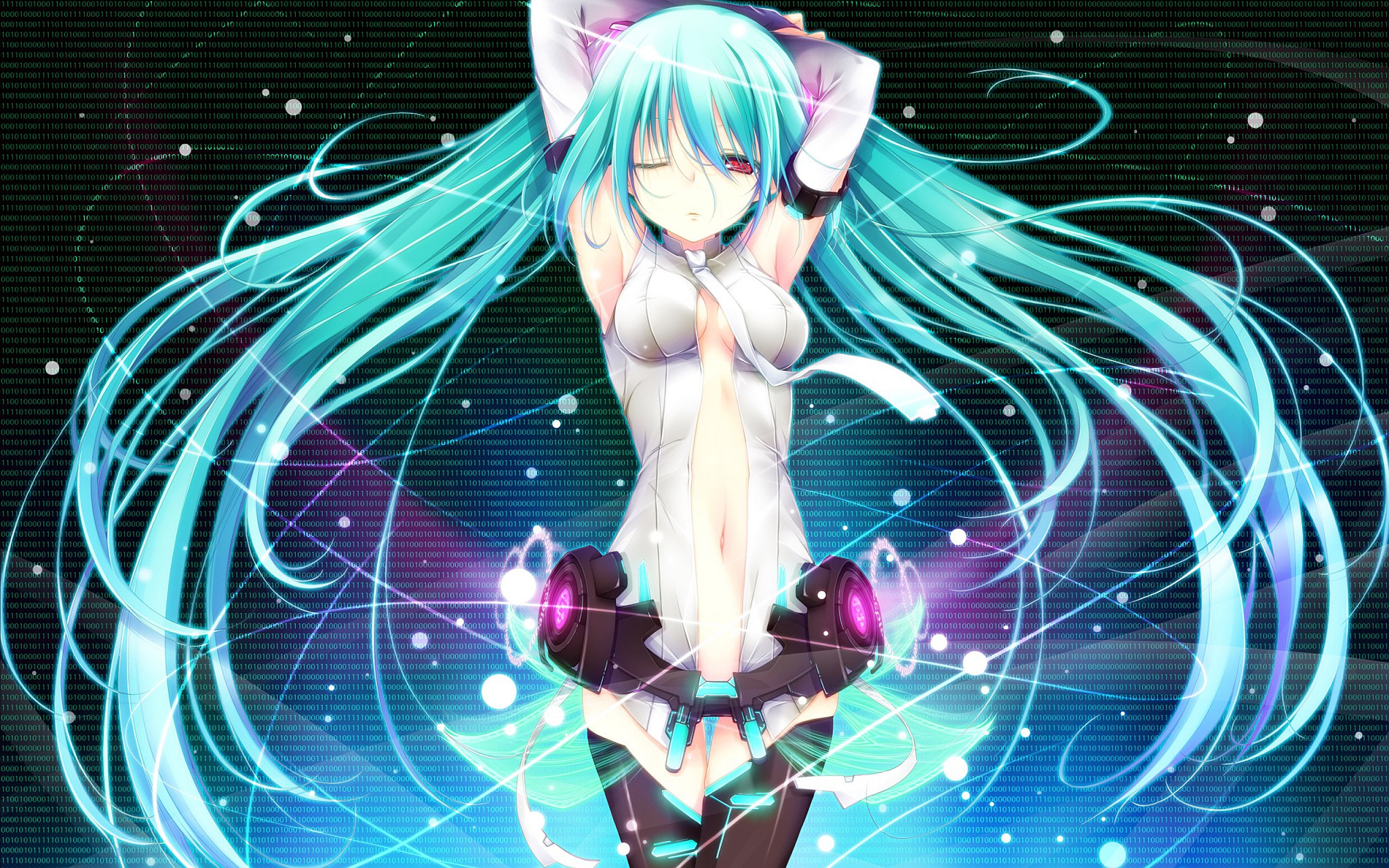Description: A woman with blue hair and a cat ears is standing in front of a blue background with stars and lines.
