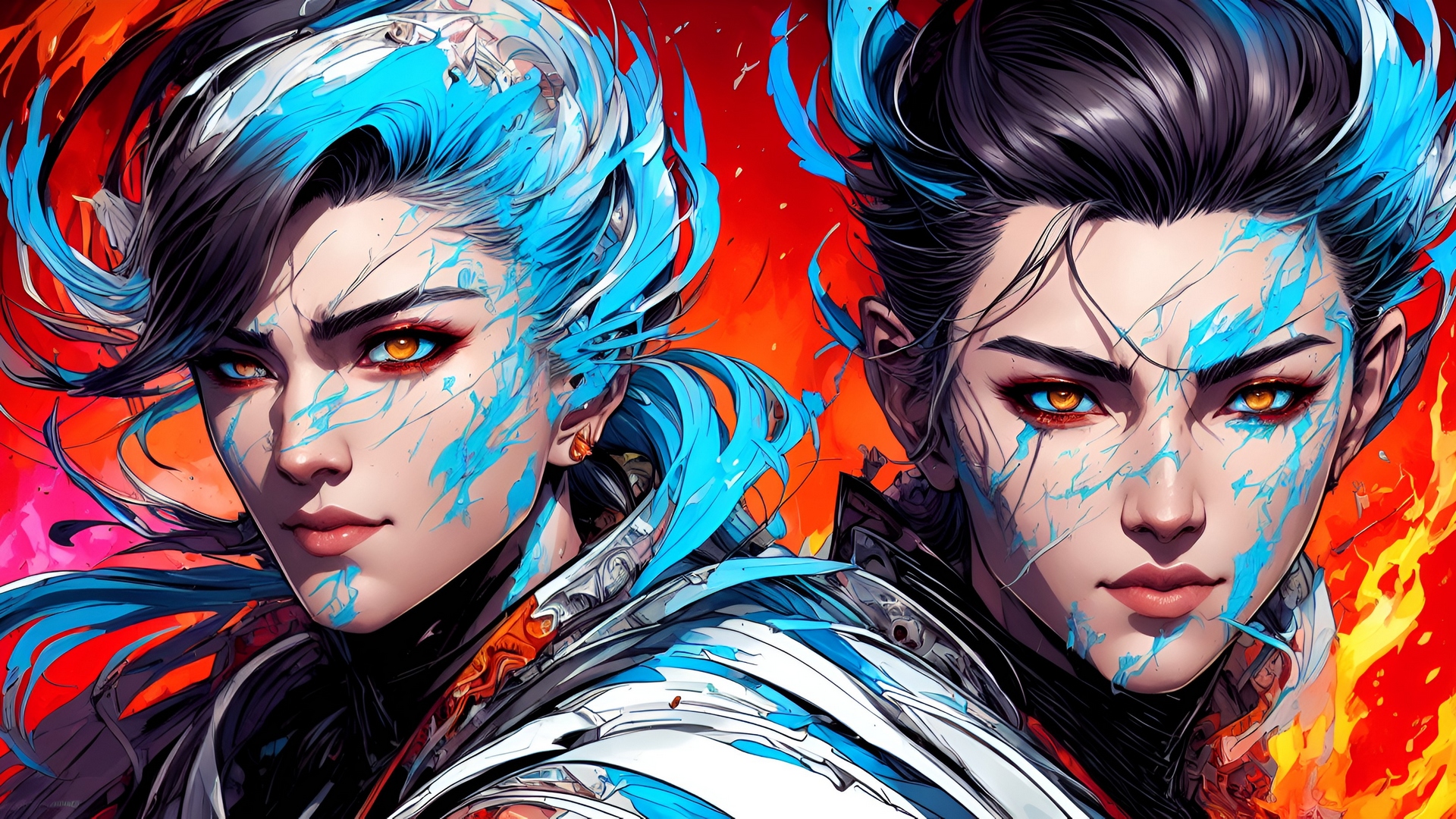 Description: Two women with blue hair and blue eyes are in front of a red background with orange and blue streaks.
