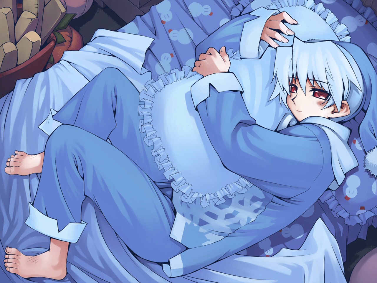 Description: A person laying on a bed with a blue outfit on and a white hair and eyes closed.