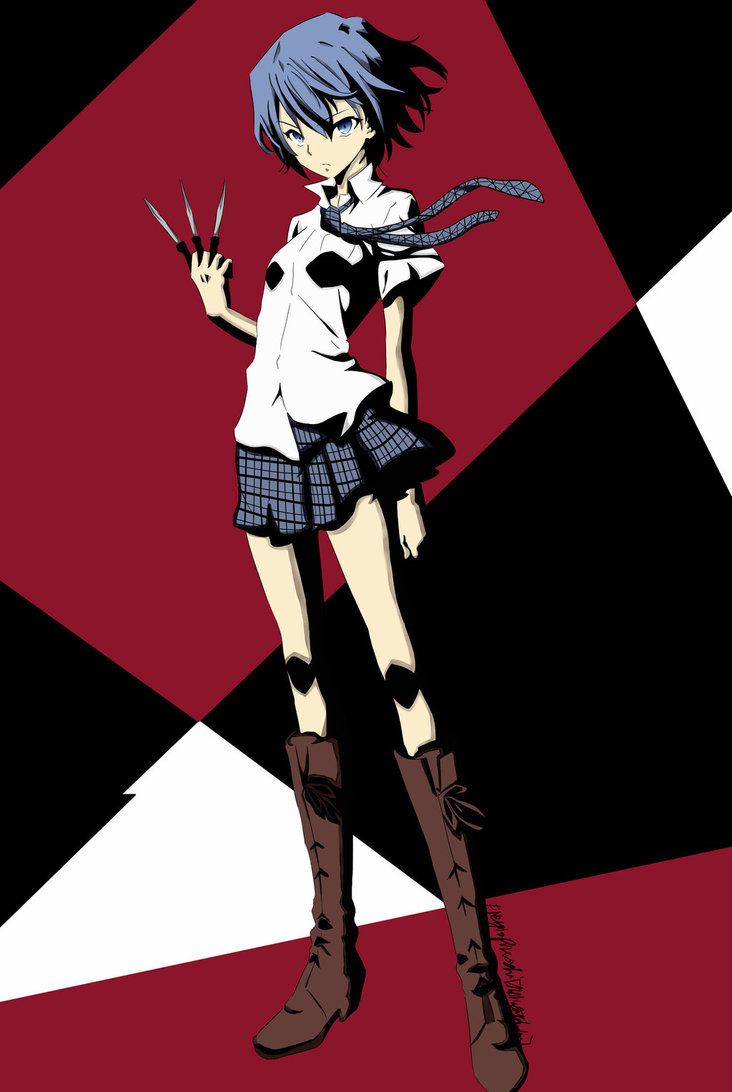 Description: A girl with blue hair and boots holding scissors in her hand and a black and white background with a red and black design.