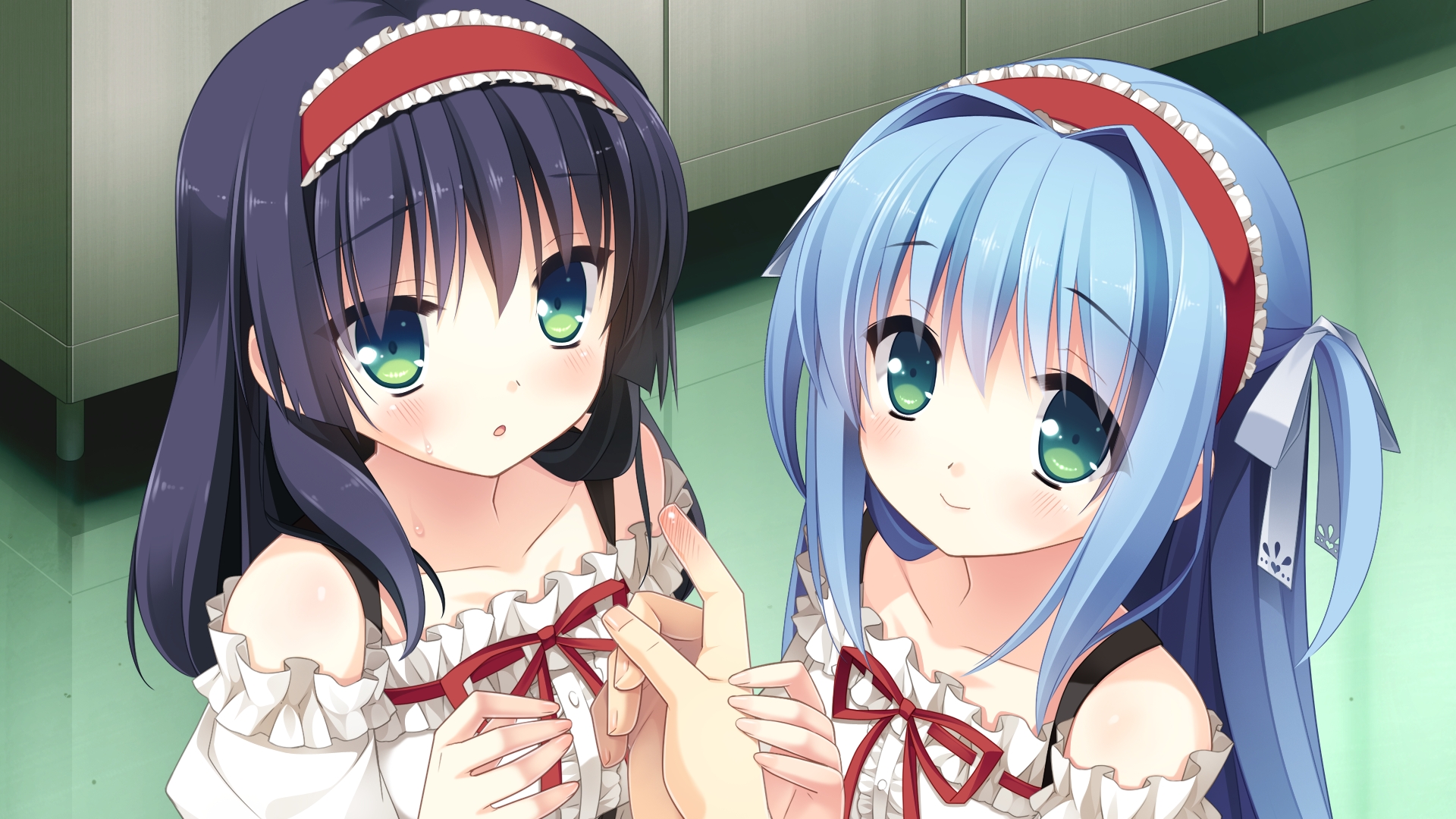 Description: Two anime girls with blue hair and green eyes are looking at their own reflection in a mirror together.
