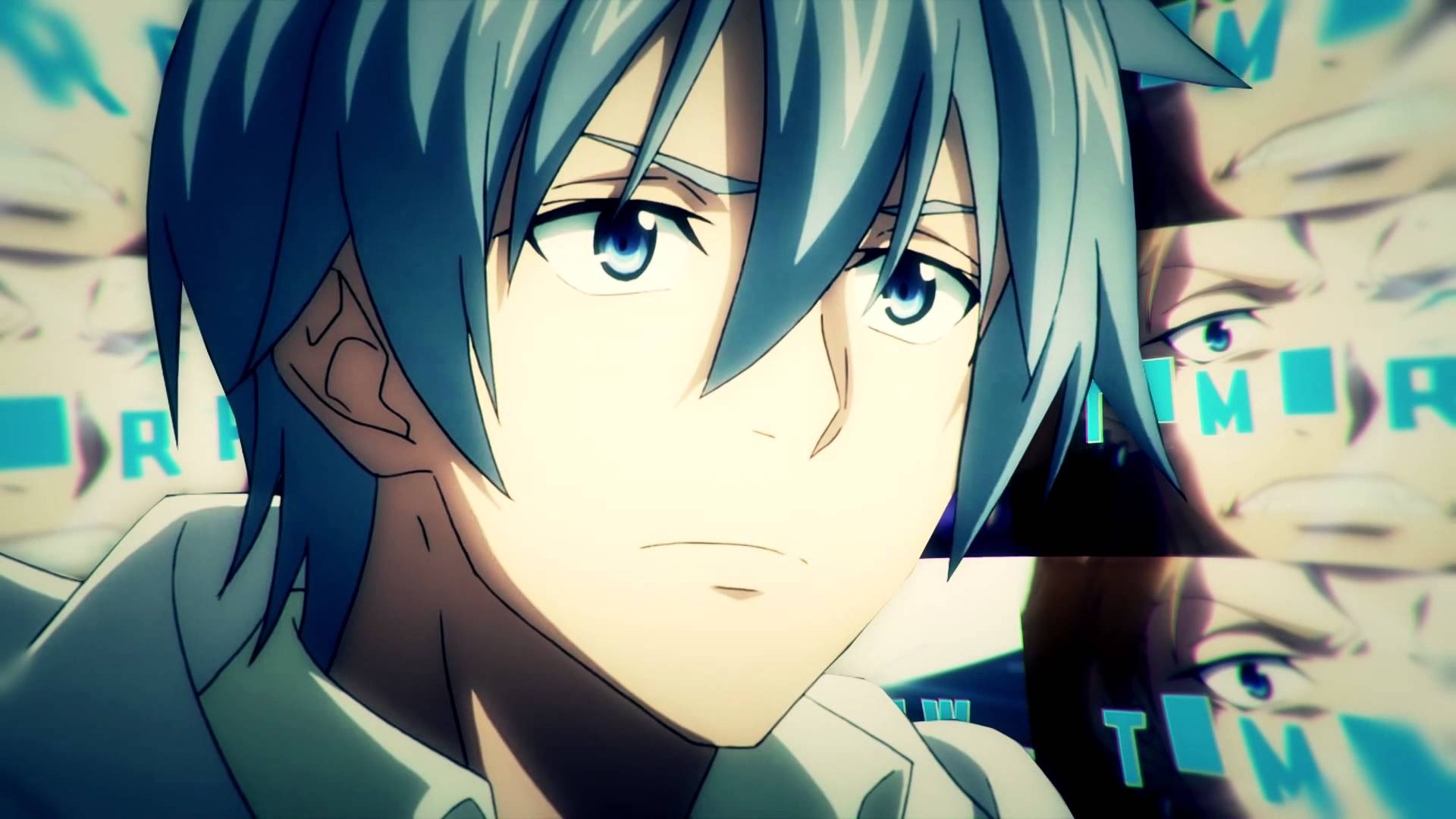 Description: A man with blue hair and a white shirt is staring at something in the distance with other men behind him.