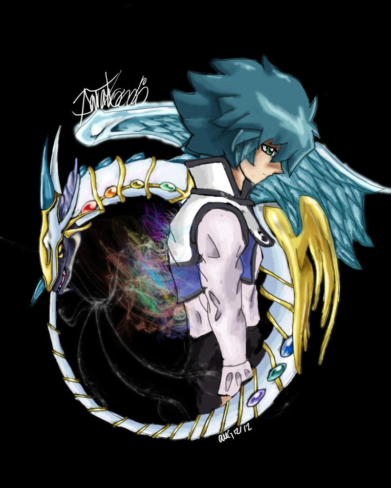 Description: A drawing of a person with blue hair and wings on a black background with a white circle around it.