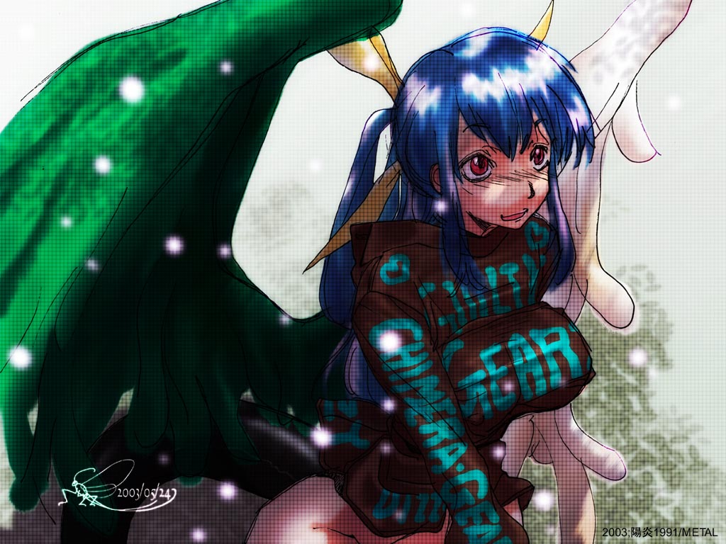 Description: A woman with blue hair and a green dragon wings on her back.