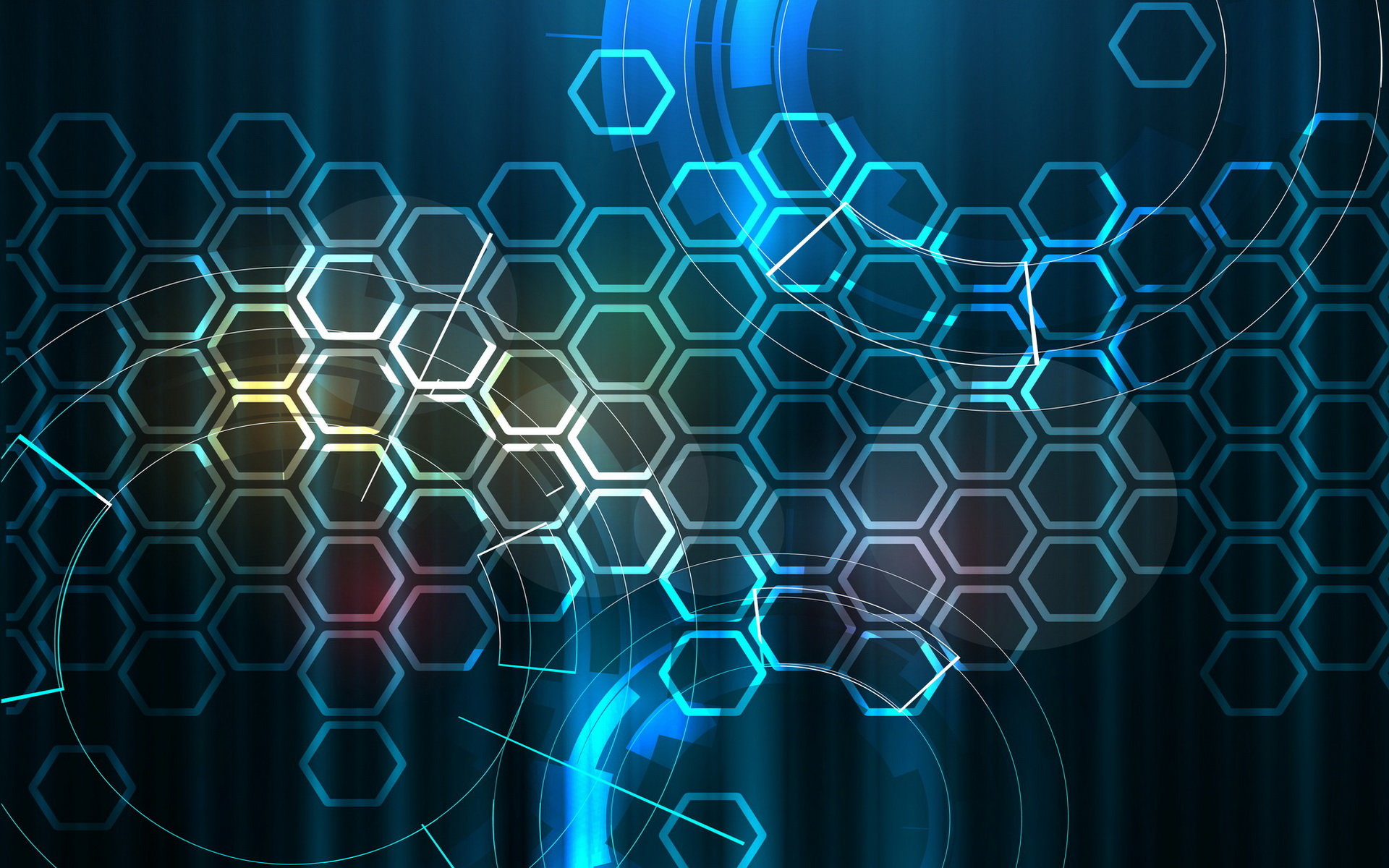 Description: A blue abstract background with hexagonal shapes and lines on it.