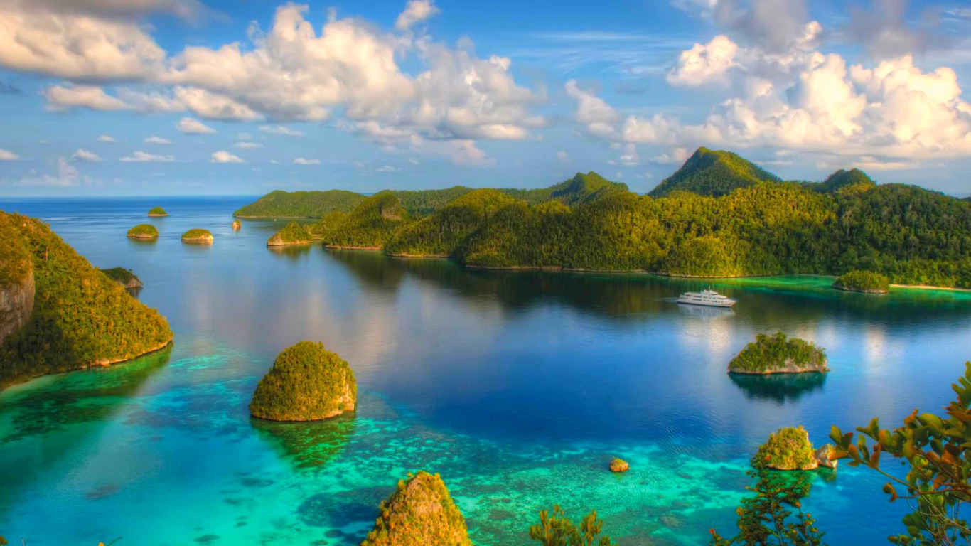 Description: A beautiful blue lagoon surrounded by green mountains and blue water with a boat in the water and clouds in the sky.
