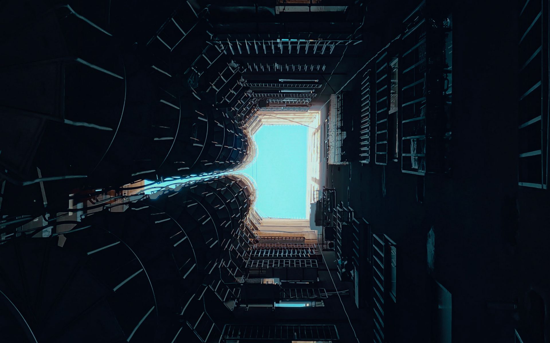 Description: A room with a blue light coming from the ceiling and a window in the middle of the room with a blue light coming from the ceiling.
