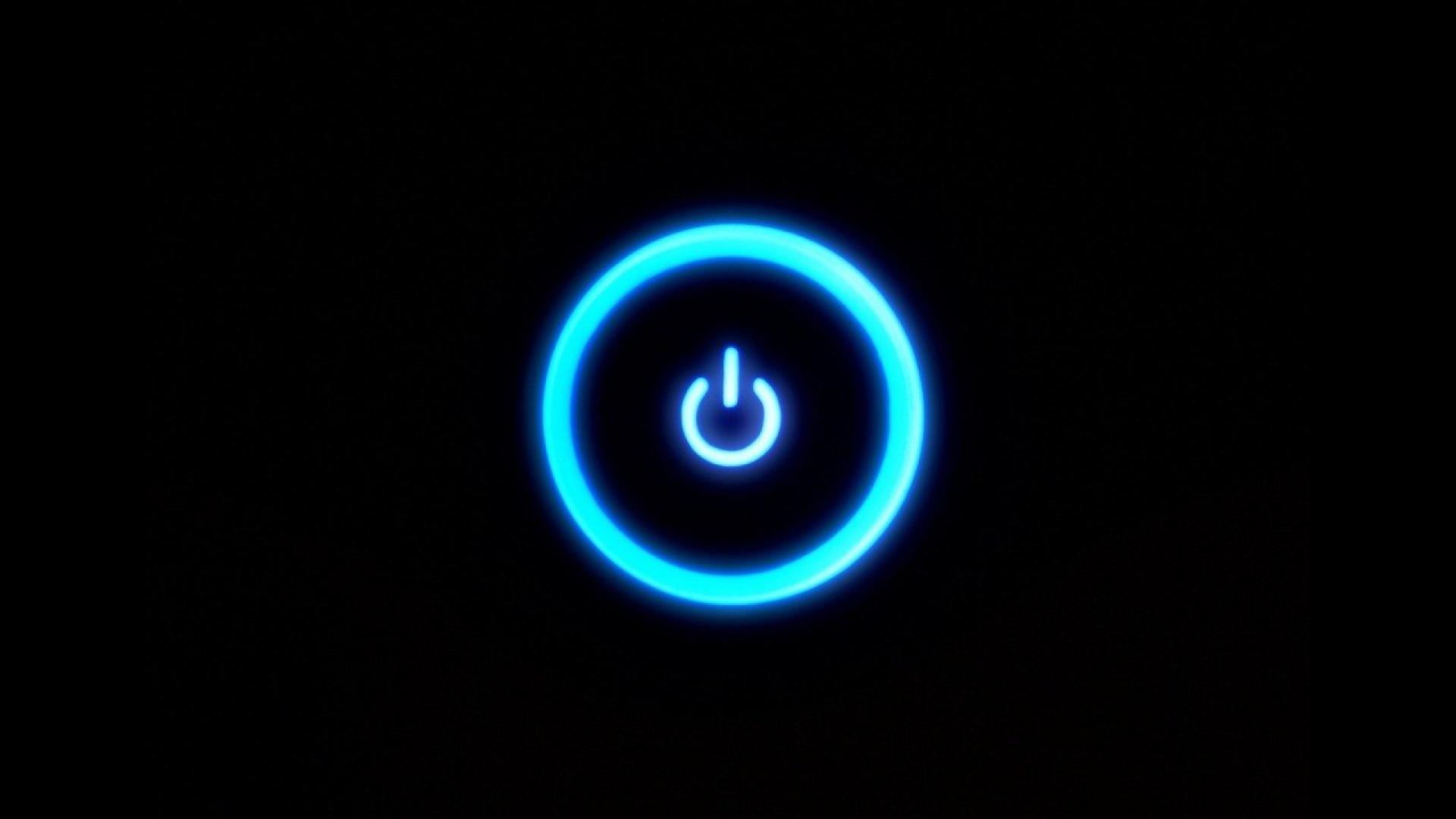 Description: A blue light up button on a black background with a dark background and a black background with a blue light up button.