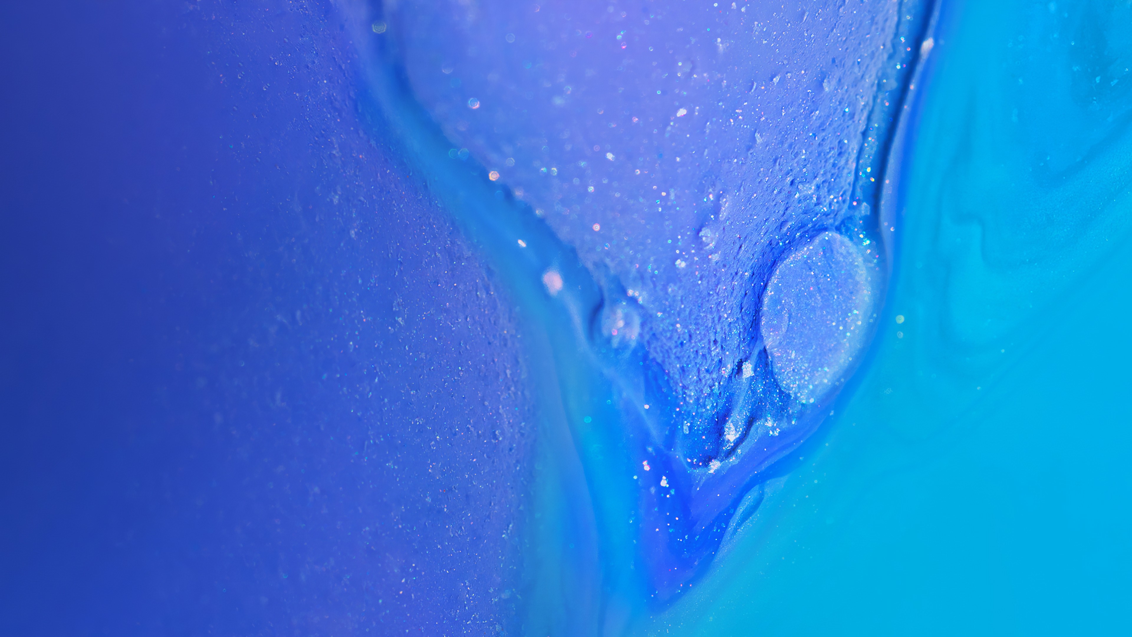 Description: A blue liquid with bubbles and a drop of water on it's surface.