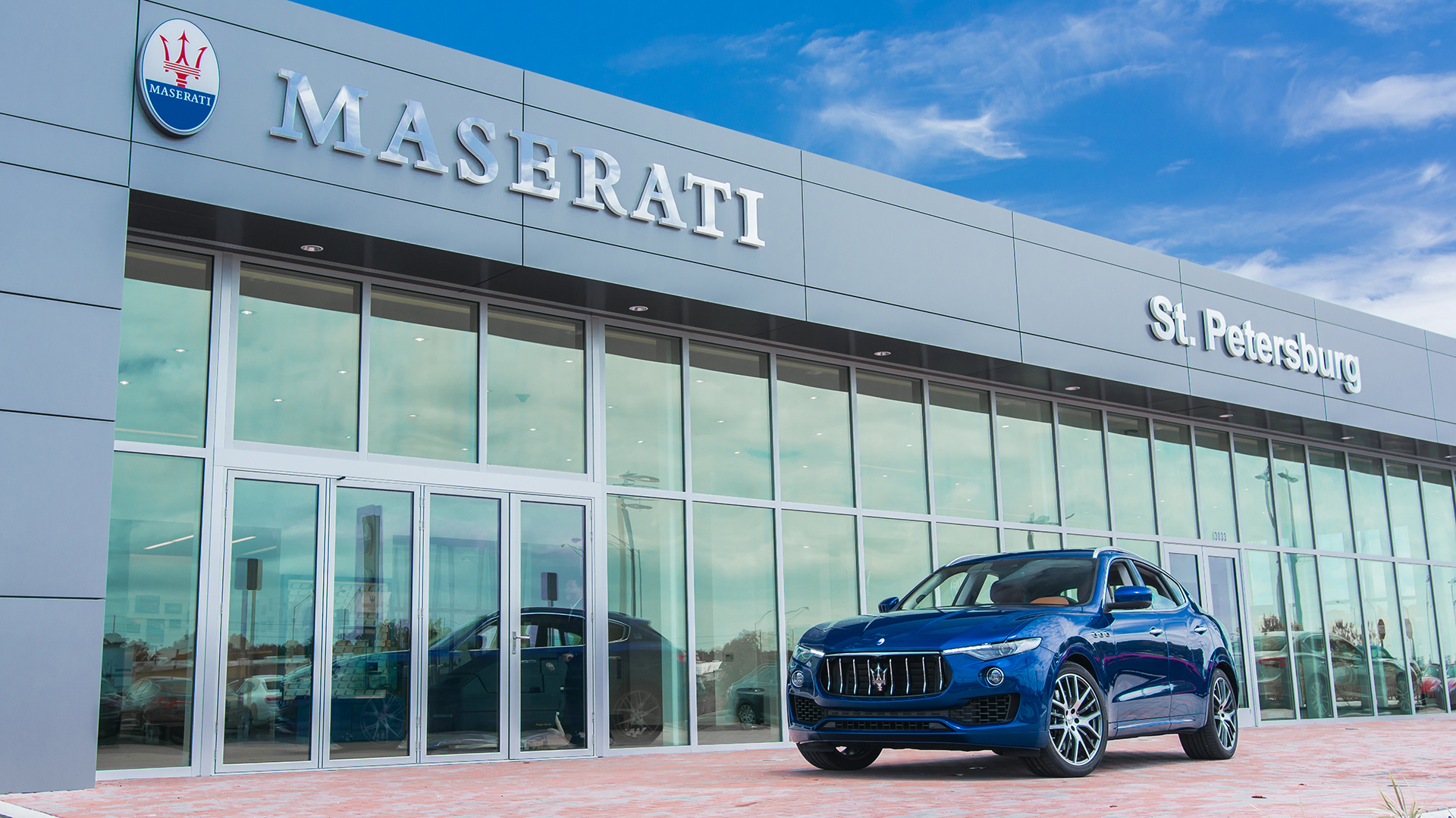 Description: A blue maserati car parked in front of a building with glass doors and a sky background with clouds.