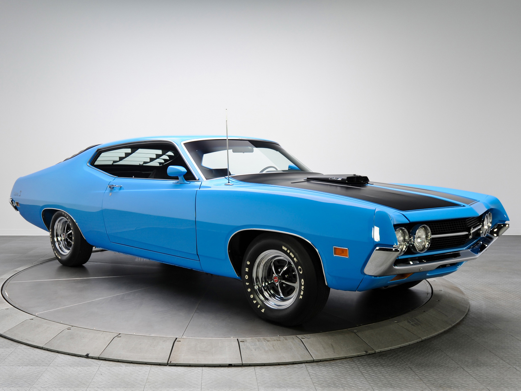 Description: A blue muscle car on a circular display stand in a room with a white wall and a black and white floor.