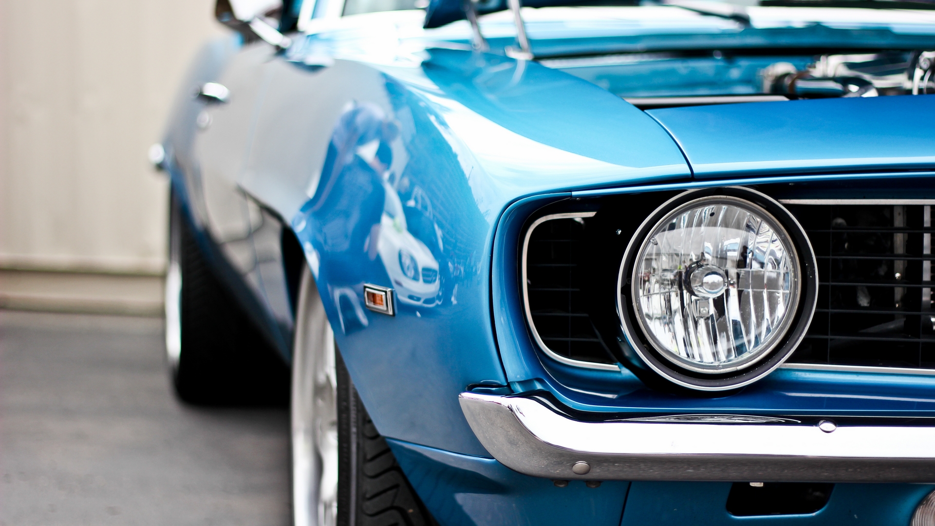 Description: A blue mustang mustang with a hood up and a grill grille on it's headlight is shown.