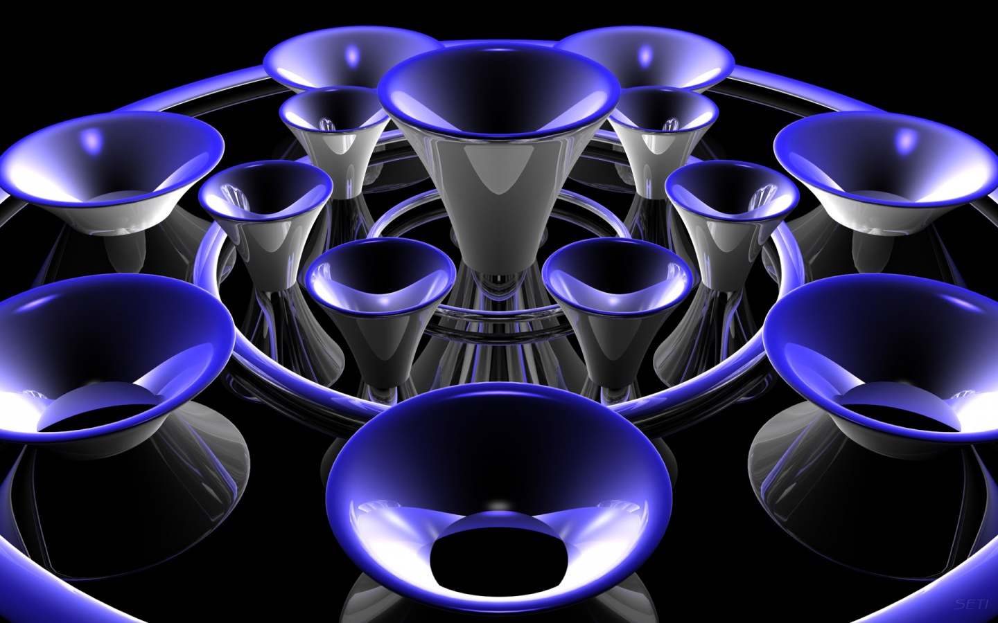 Description: A digital image of a bunch of blue objects in a circle of blue lights on a black background with a black background.