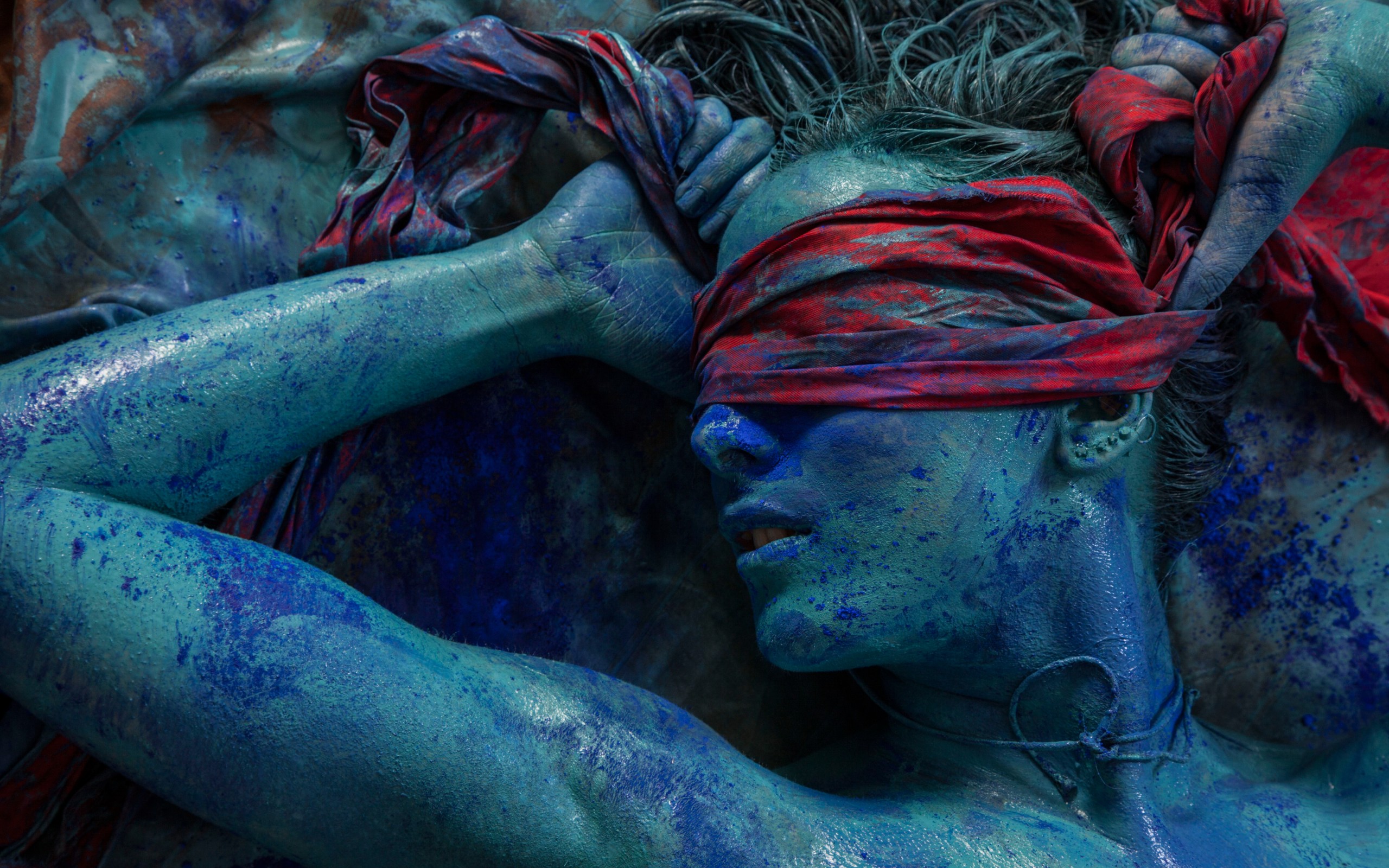 Description: A woman covered in blue and red paint laying on the ground with her head covered in blue powder and her hands behind her head.