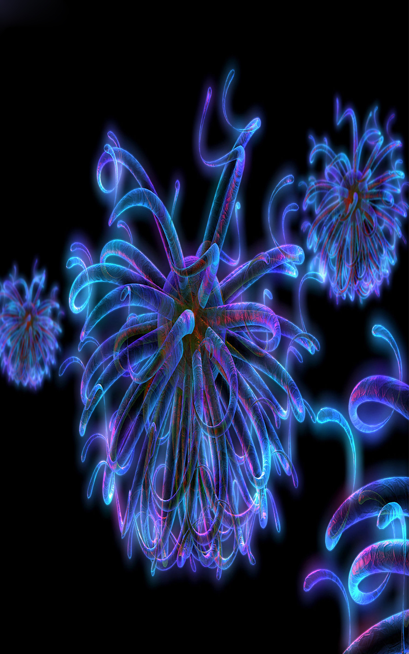 Description: A computer generated image of a flower with blue and pink lights on it's petals and petals are shown.