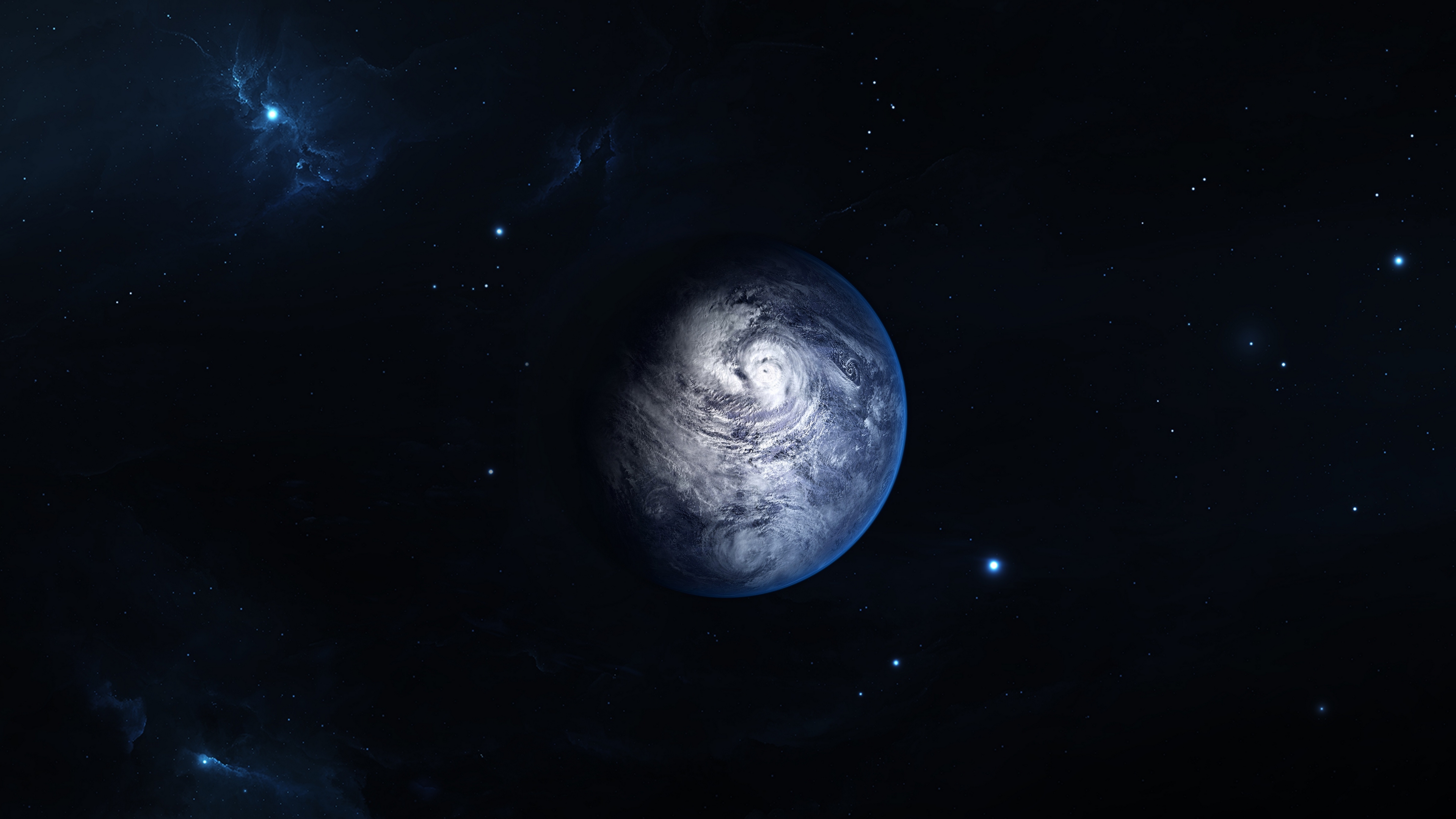 Description: A blue planet in the middle of a dark space with stars around it and a bright light shining on the planet.