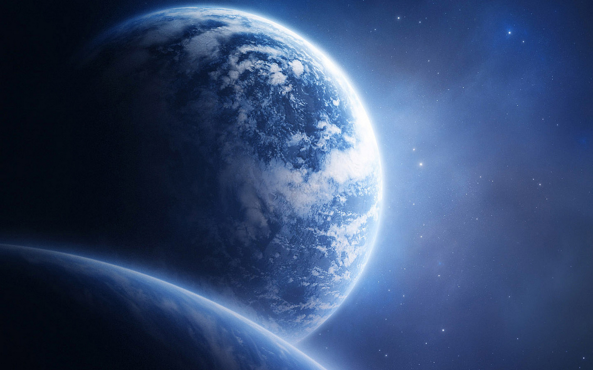 Description: A blue planet with a bright light shining on it's side and a dark background with stars and clouds.